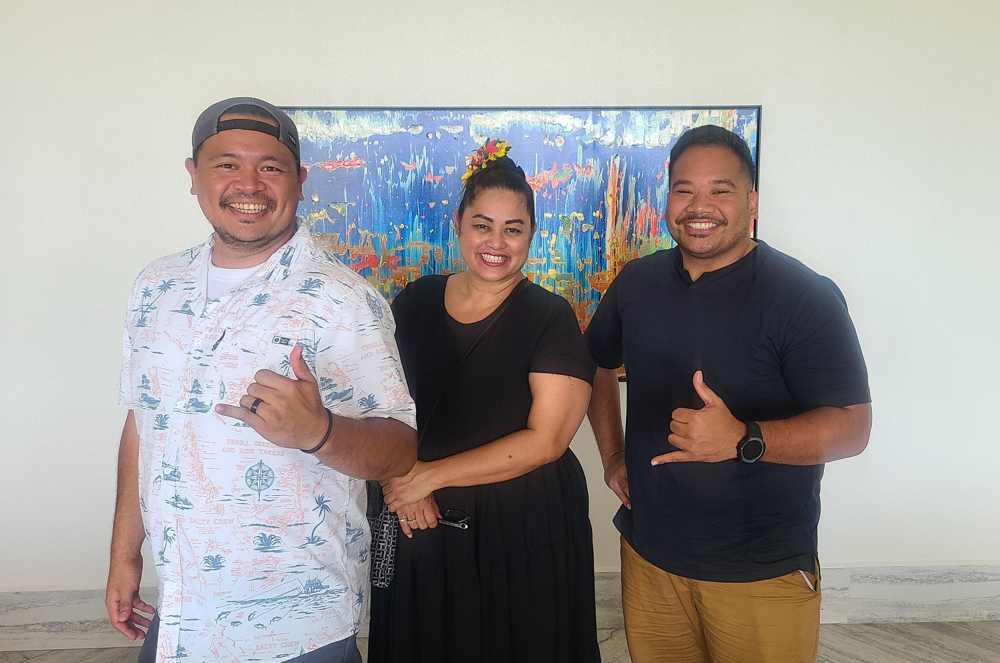 From left, Save the Music Foundation and Marianas Got Talent executive director Donovan Castro, chair Arlene Reyes, and sergeant-at-arms Dwayne Castro smile after an interview with Saipan Tribune at the Crowne Plaza Resort Saipan in Garapan.