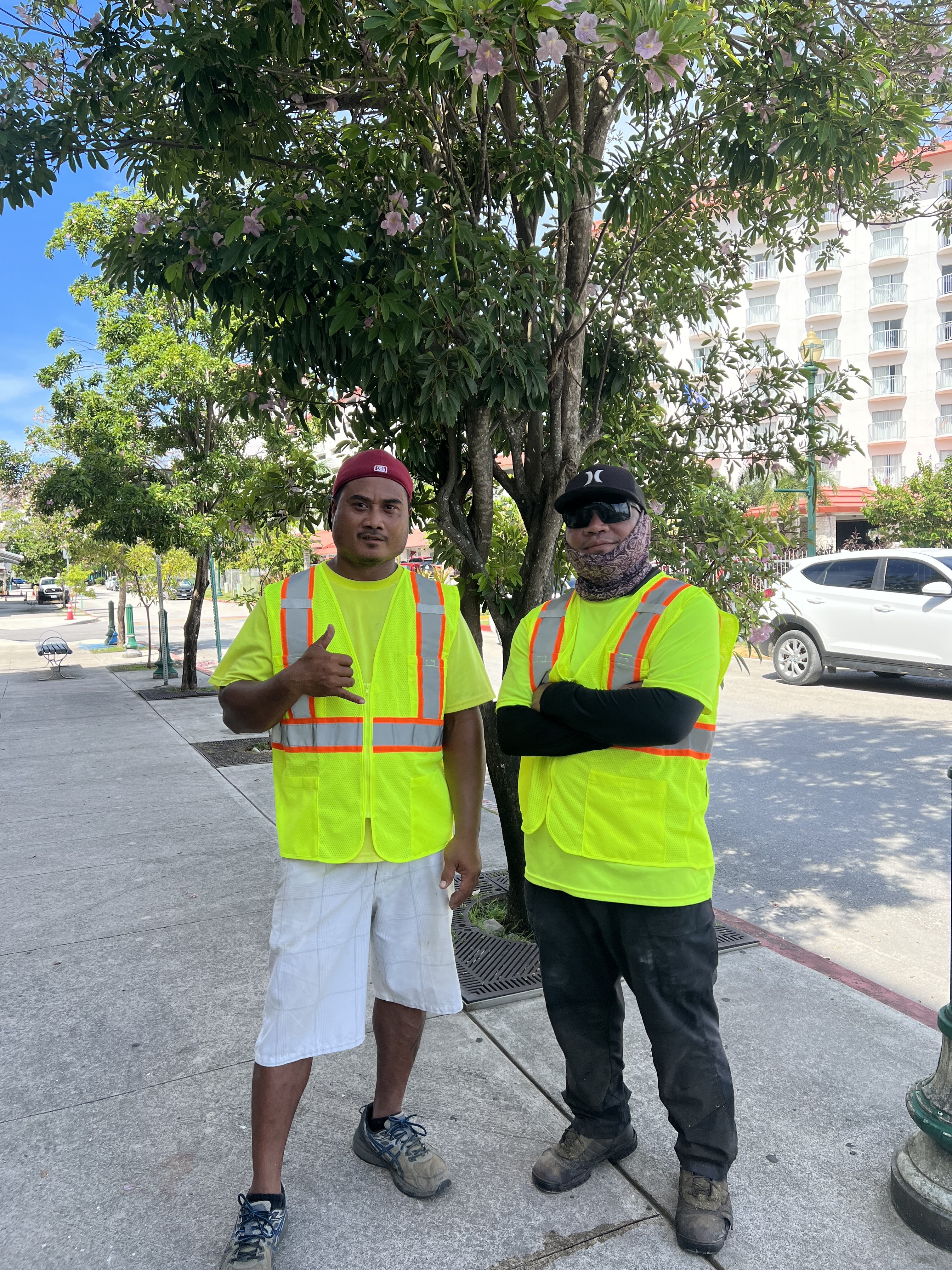 LJ’s Lawncare Service’s Jeffrey David, left, and Dennis Reyes take a breather from cleaning major streets in Garapan on Aug. 7, 2024, as part of the Marianas Visitors Authority’s ongoing contribution to enhance the main tourist district. The MVA is encouraging area businesses to clean up their adjacent areas as the Garapan Revitalization Project enters its next phase.