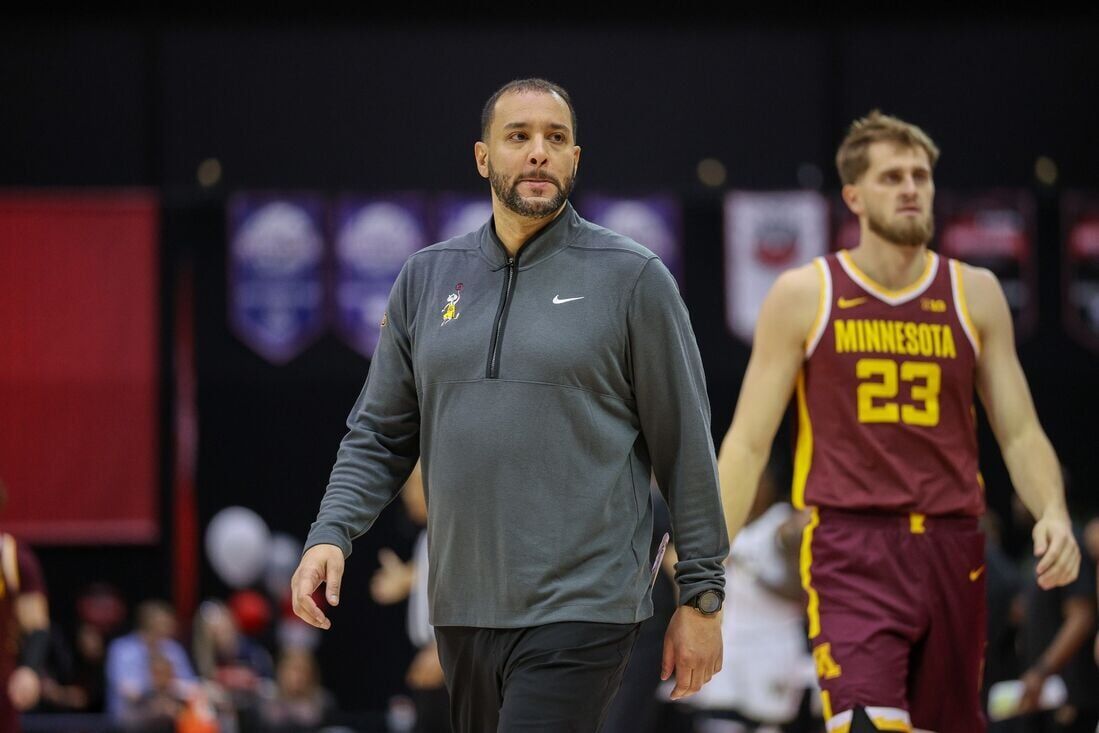 Nov 29, 2024; Orlando, Florida, USA; Minnesota Golden Gophers head coach Ben Johnson looks on against the Wake Forest Demon Deacons in the second half at ESPN Wide World of Sports Complex. Mandatory Credit: Nathan Ray Seebeck-Imagn Images
