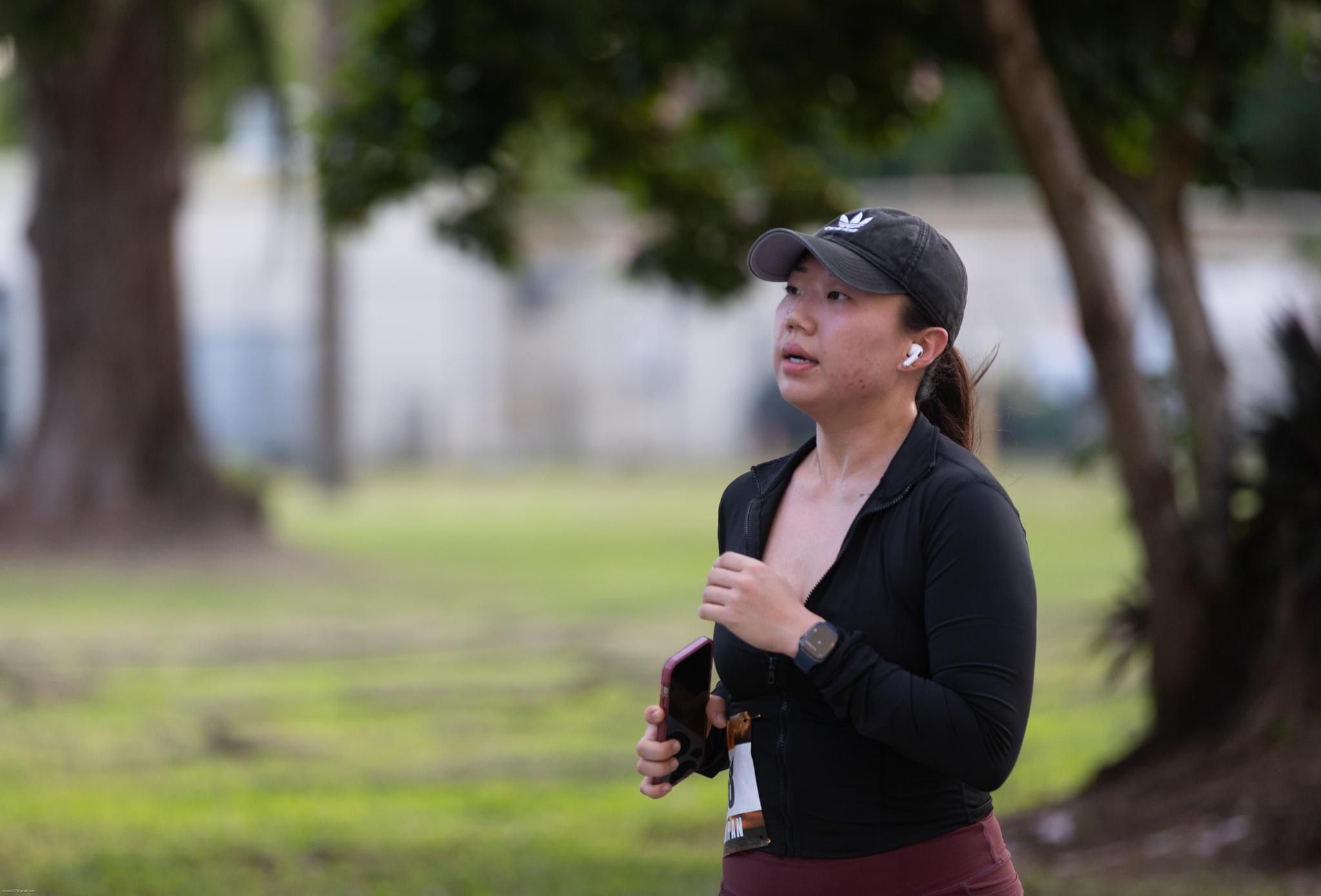First place in the women’s Armed Forces category, Hanoul Sky Lee, runs into the finish line at the former Hyatt Regency Club Elan parking lot during the Run Saipan’s 2nd Annual Veteran’s Day 5K course