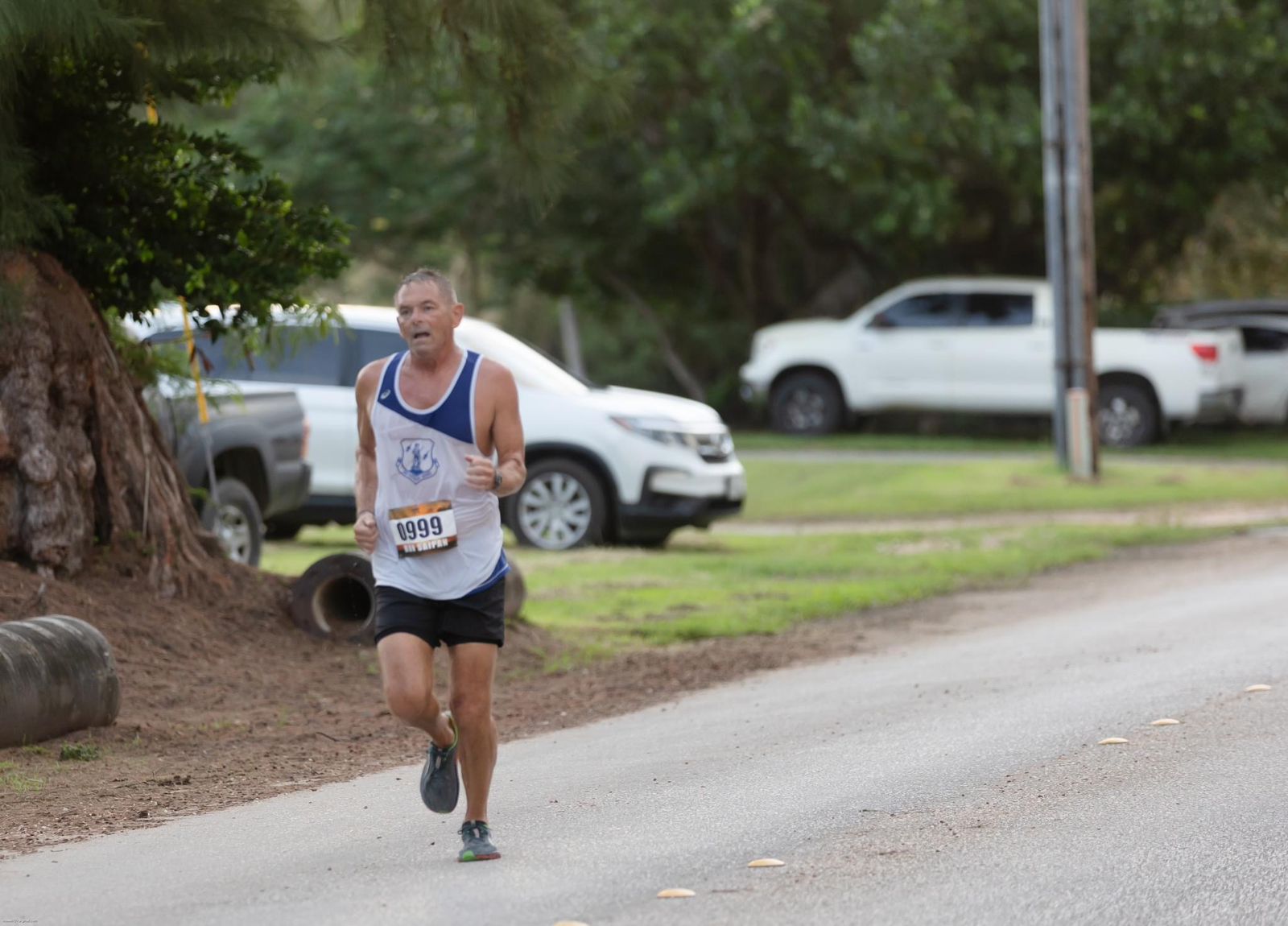 First place in the men’s Armed Forces category, Don Brennan, runs into the finish line at the former Hyatt Regency Club Elan parking lot during the Run Saipan’s 2nd Annual Veteran’s Day 5K yesterday.