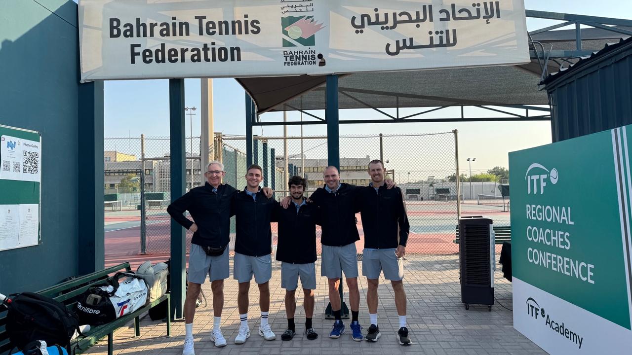 The CNMI Davis Cup team, from left, captain Jeff Race and players Colin Ramsey, Robbie Schorr, Tomas Abel, and Colin Sinclair prior to their tie against Bahrain last Wednesday at the Bahrain Tennis Federation tennis courts in Isa Town, Bahrain.