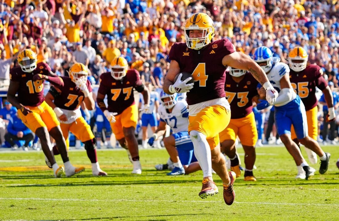 Arizona State running back Cam Skattebo (4) runs into the endzone for a touchdown against BYU during the first half at Mountain America Stadium in Tempe on Nov. 23, 2024.