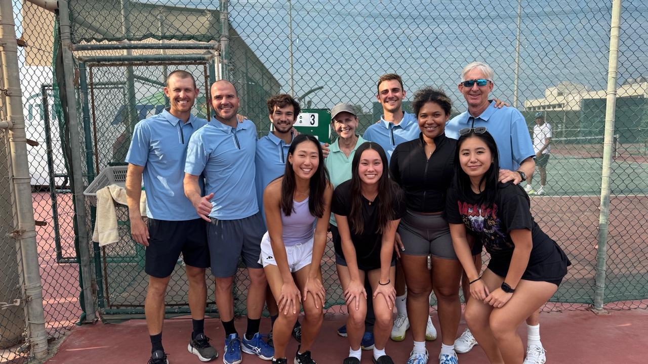 The CNMI 2024 Davis Cup and Billie Jean King Cup players and officials pose for a group at the Bahrain Tennis Federation tennis courts in Isa Town, Bahrain. Back from left, Colin Sinclair, Tomas Abel, Robbie Schorr, Davis Cup team manager Karen Buettner, Colin Ramsey, and Davis Cup captain Jeff Race. Front row from left, Carol Lee, Hye Jin Elliott, Asia Raulerson, and Isabel Heras.