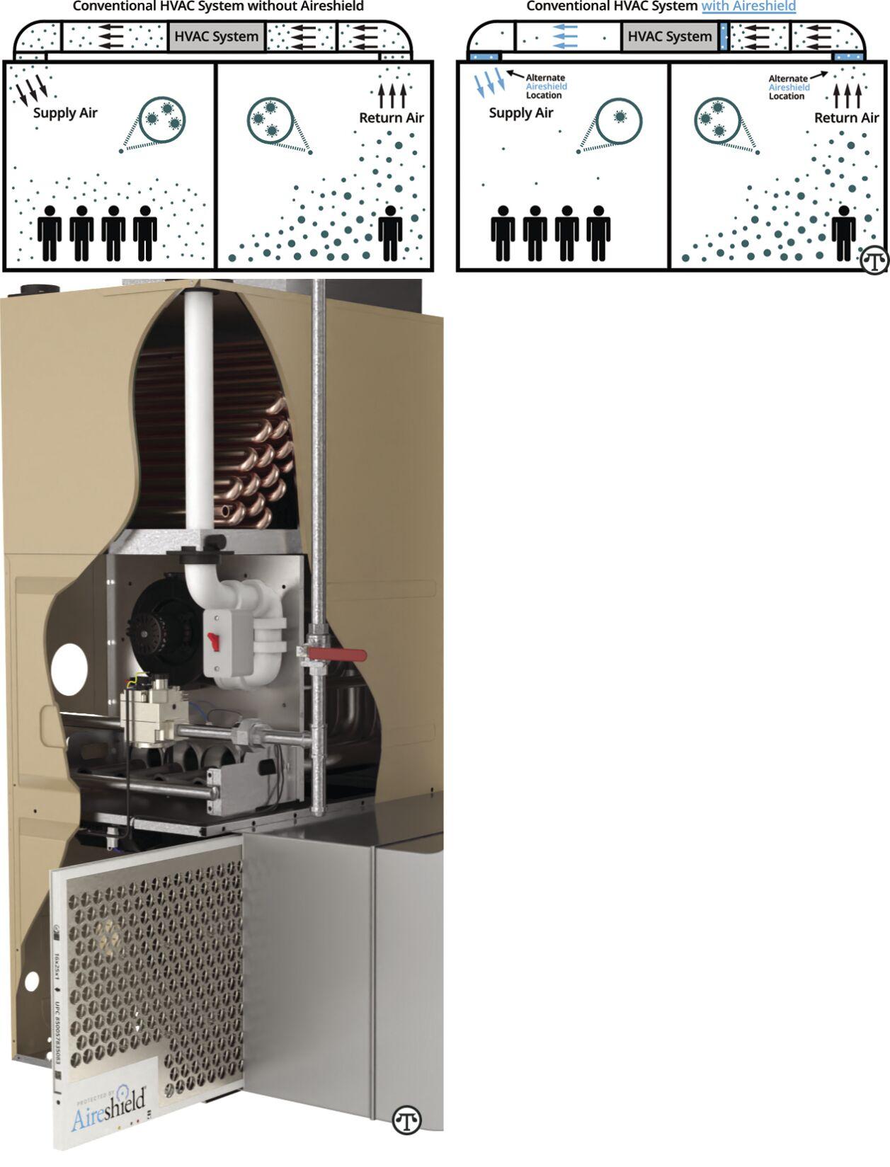 One example is Aireshield® by Reviveaire LLC. This patented non-thermal plasma disinfection system resembles the size and thickness of a common HVAC fabric filter used in most home central air conditioning and/or heating systems. It’s easily installed by HVAC technicians or Do-It-Yourselfers.