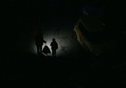 A man shines a flashlight as he and his son walk down the dark street during a blackout in Kyiv on November 19, 2024, caused by a “massive” aerial barrage amid Russian invasion in Ukraine