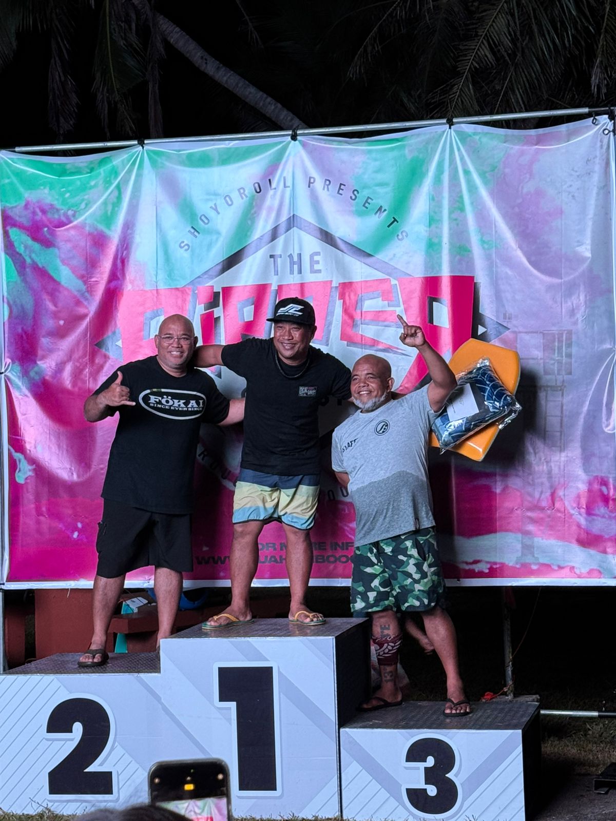 First place of the master’s division in the Guahan Bodyboarder’s Inc. Ripper Classic, the CNMI’s Frank Ramon, poses on the podium with the second and third place winners during the awards ceremony last Sunday at the Boat Basin in Hagåtña, Guam.