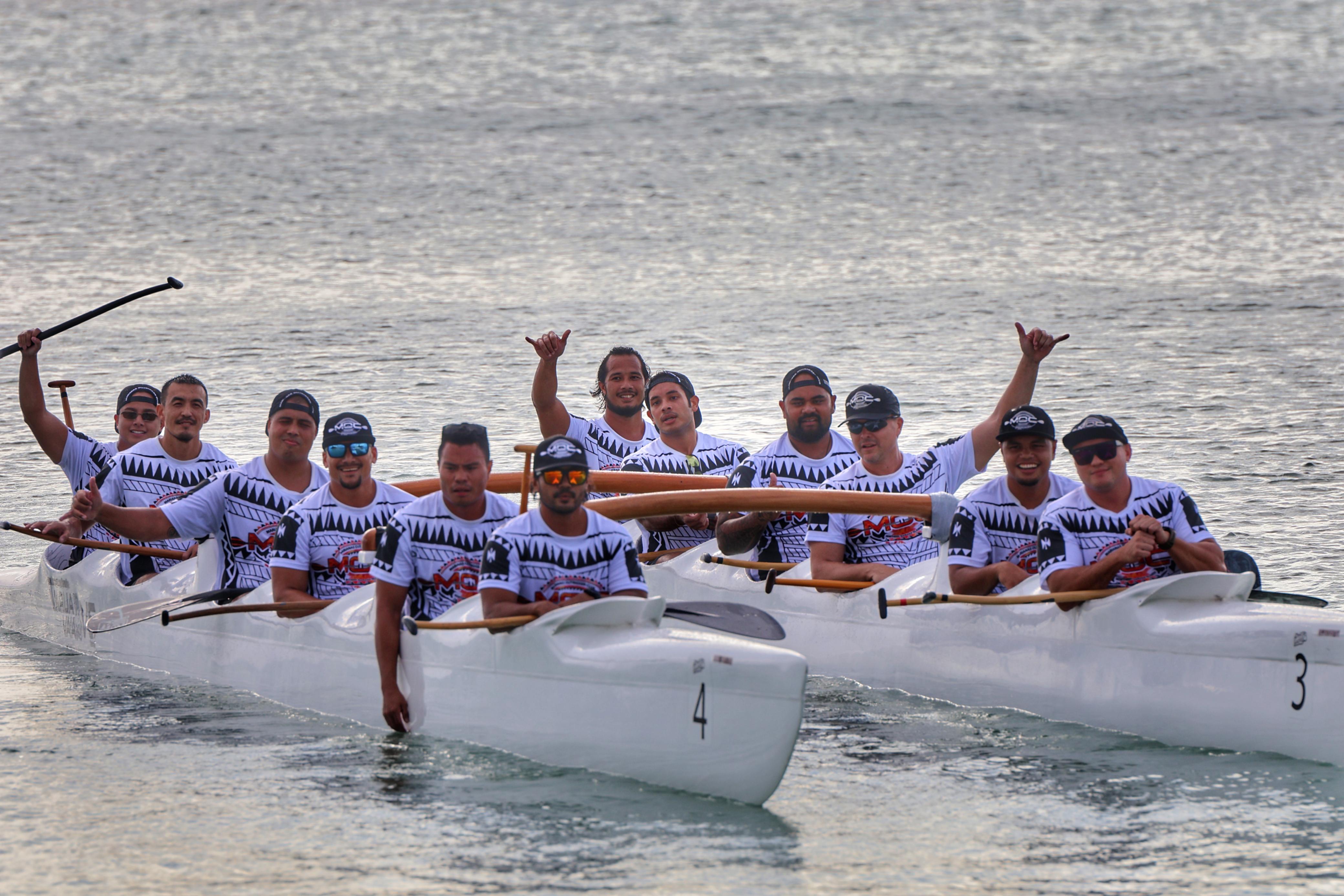 Marianas Outrigger Club’s V12 men’s team poses in celebration on their way back to shore after the gold medal win in the finals of the 500m race on the first day of races in the 24th Micronesia Cup Canoe Race last Friday at the Crowne Plaza Resort Saipan.