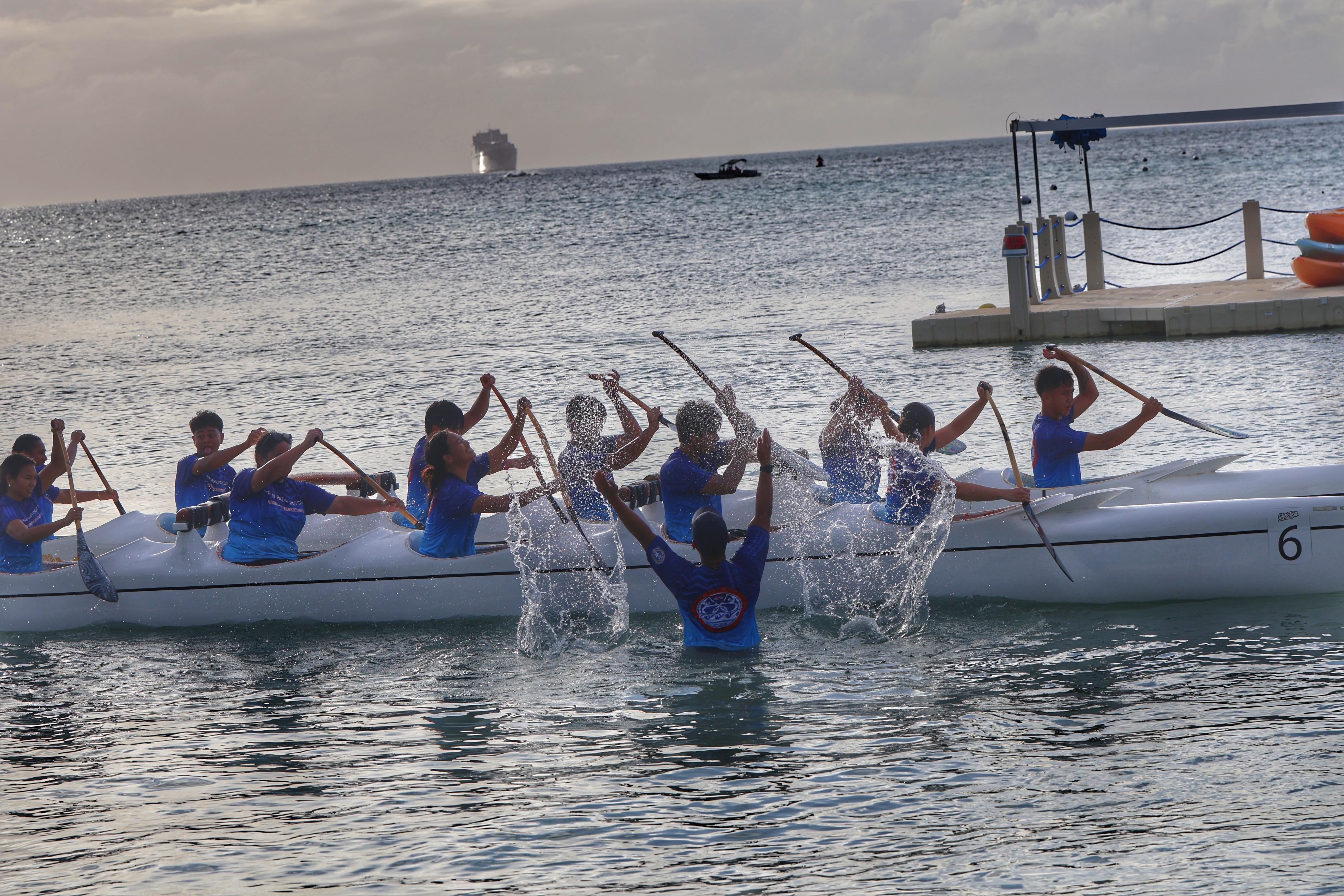 Saipan Paddling Club’s V12 mixed team paddles unto shore as a paddler splashes water on the first day of races in the 24th Micronesia Cup Canoe Race last Friday at the Crowne Plaza Resort Saipan.