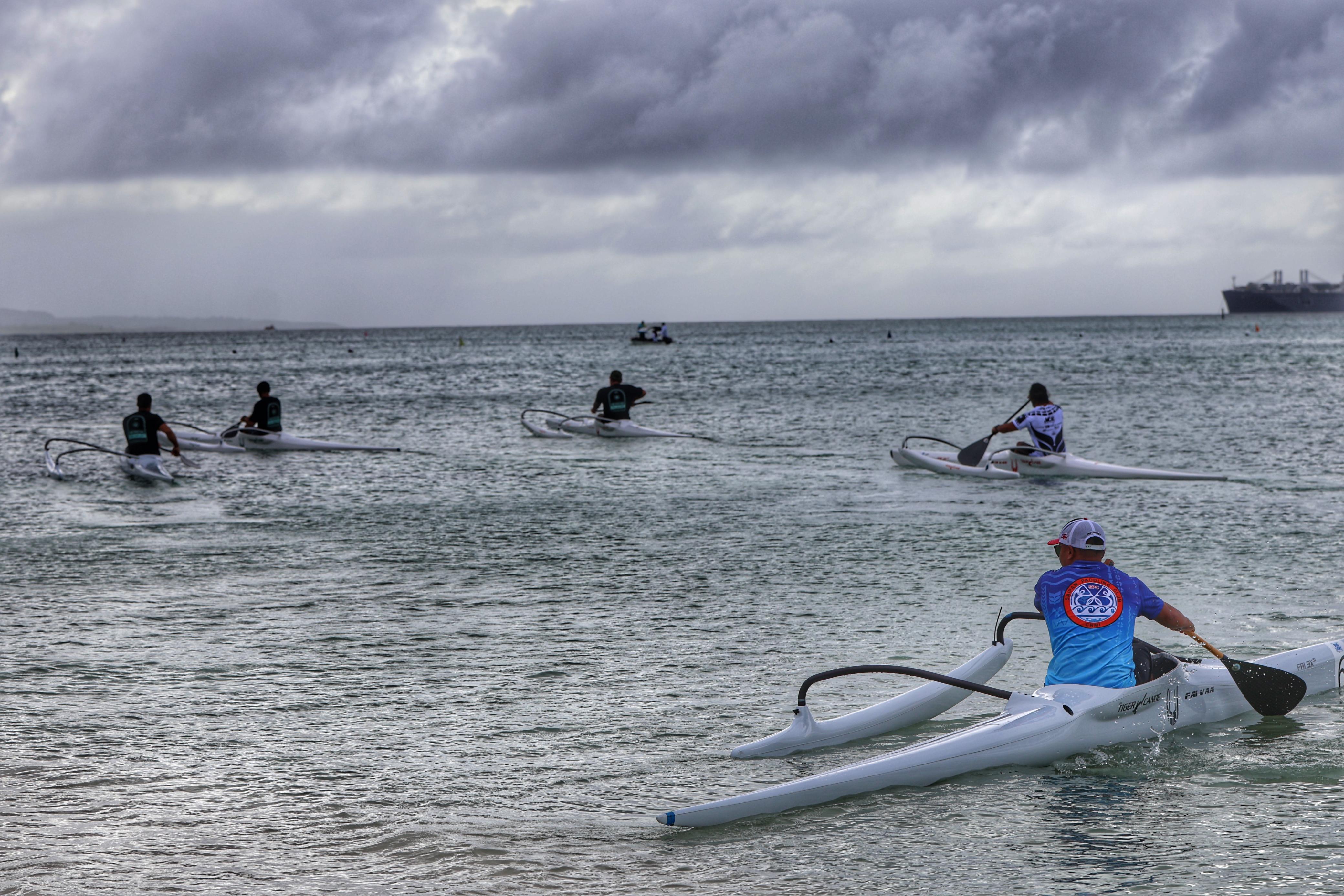 The V1 500m men’s paddlers head out to the starting line on the first day of races in the 24th Micronesia Cup Canoe Race last Friday at the Crowne Plaza Resort Saipan.