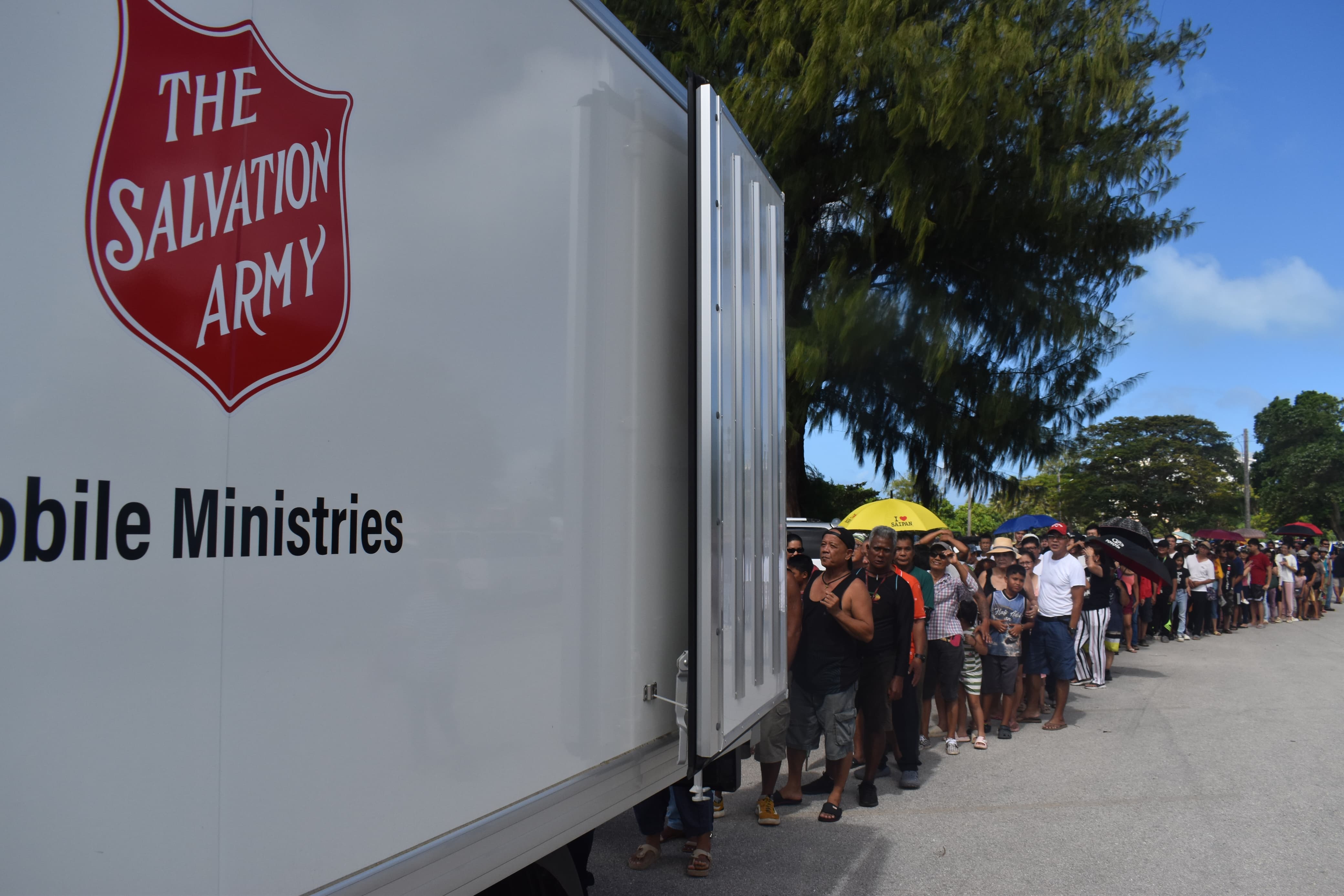 The initiative was met with an overwhelming response as hundreds gathered at the Garapan Fishing Base across the Kristo Rai Church as early as 11am for the 12pm distribution. As soon as the Salvation Army truck began pulling in, dozens appeared from out of the shade and cars and started heading towards the vehicle with some even running to the truck.