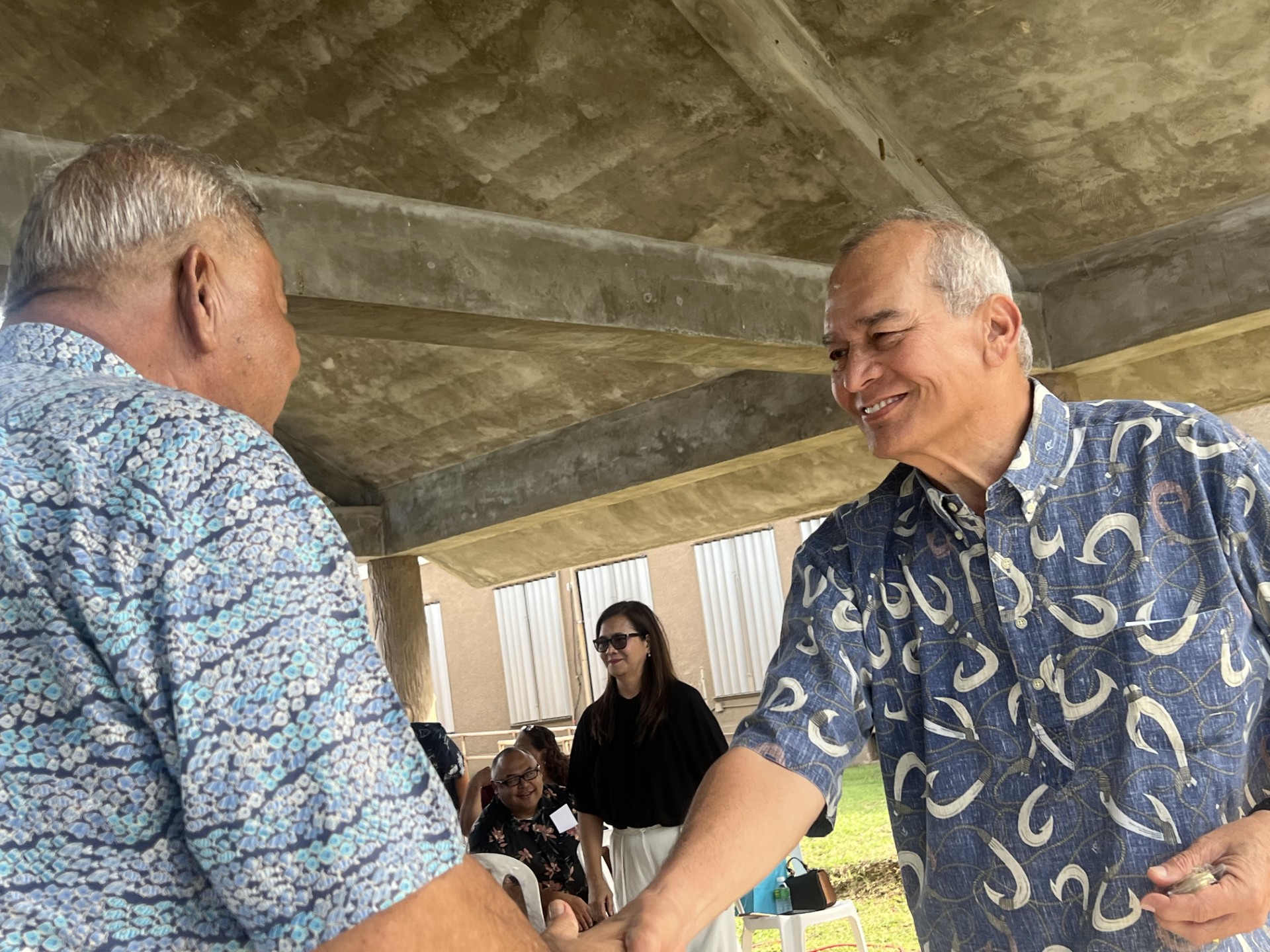 Delegate Gregorio Kilili C. Sablan (D-MP) shakes hands with Lt. Gov. David M. Apatang during his final townhall yesterday morning.