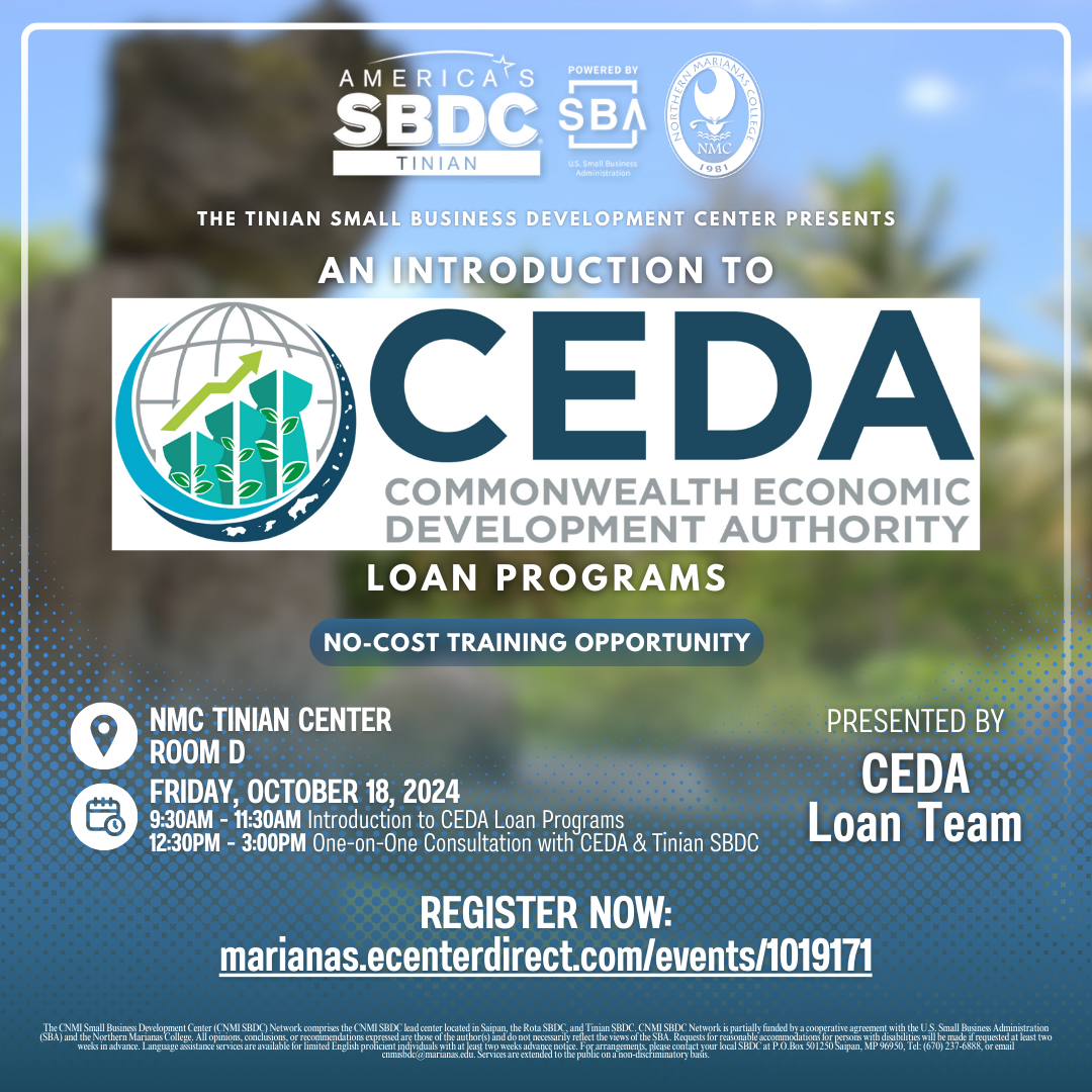 This event will feature a presentation by the CEDA Loan Department who will provide an overview of the various loan programs available to small businesses, including the newly approved State Small Business Credit Initiative 2.0 for the CNMI.