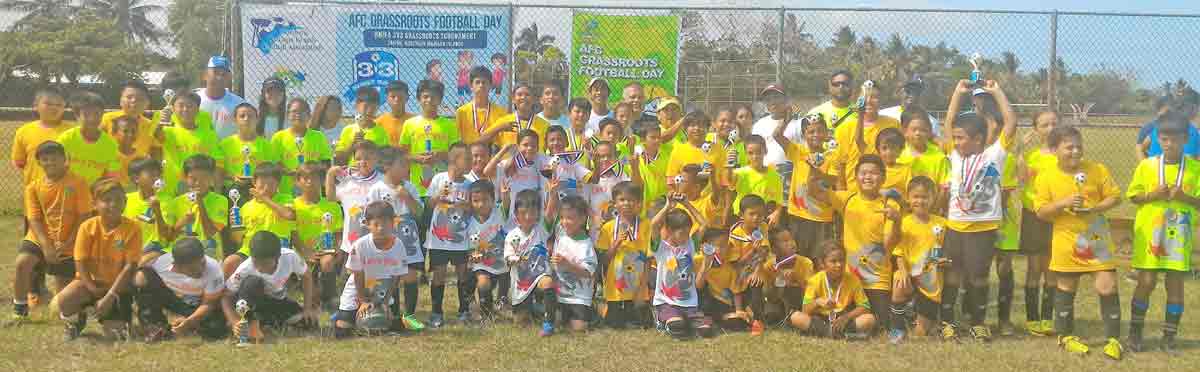 Participants in the AFC 3×3 Grassroots Football Tournament pose for a group photo after receiving their trophies, medals, and event T-shirts last at the Koblerville Elementary School Field.