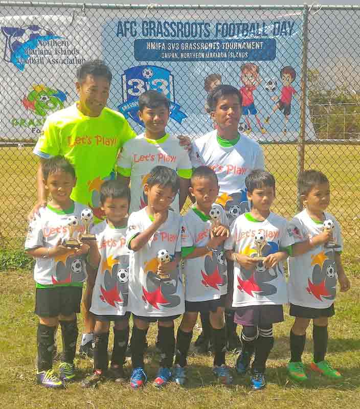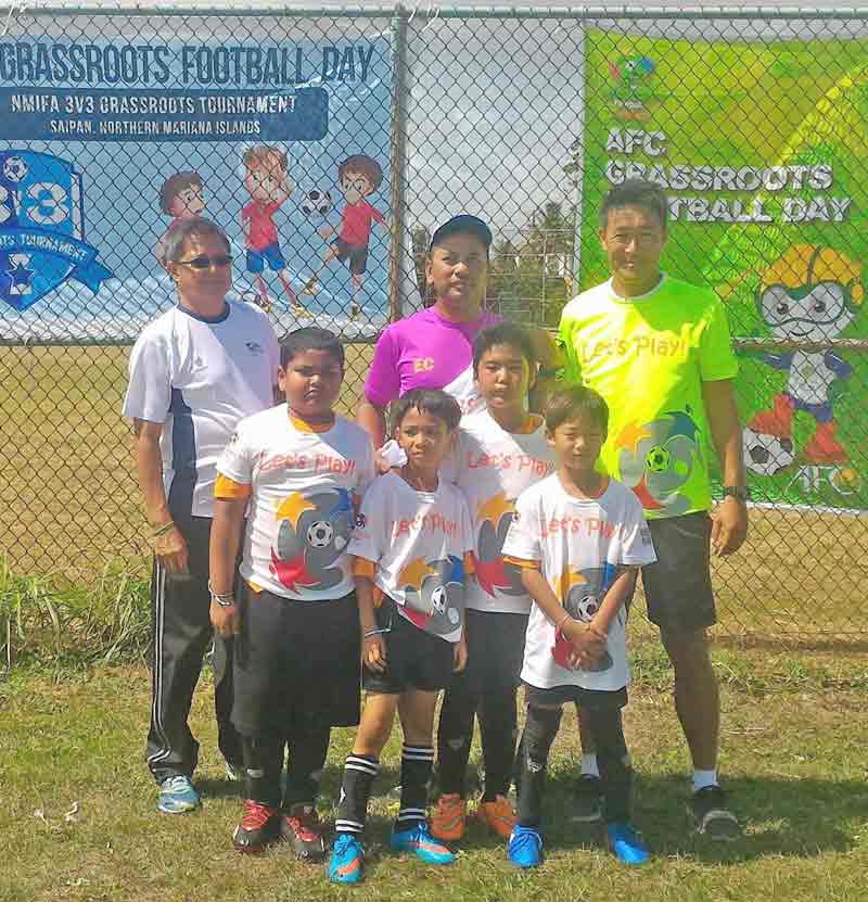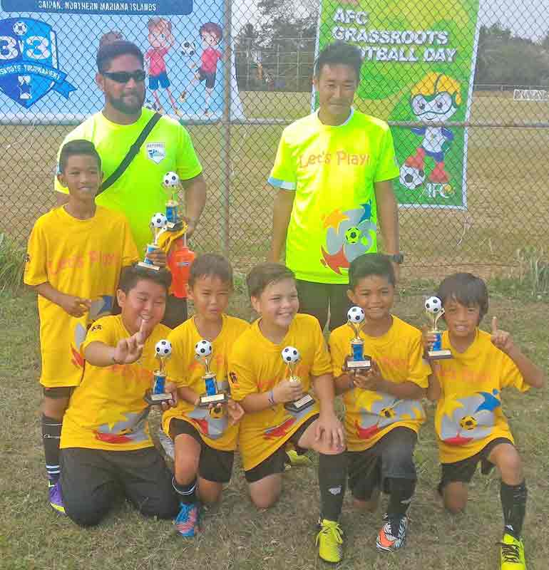 TanHoldings FC is the champion in the U8 division. They are joined in the photo by Northern Mariana Islands Football Association technical director Michiteru Mita, second row left.