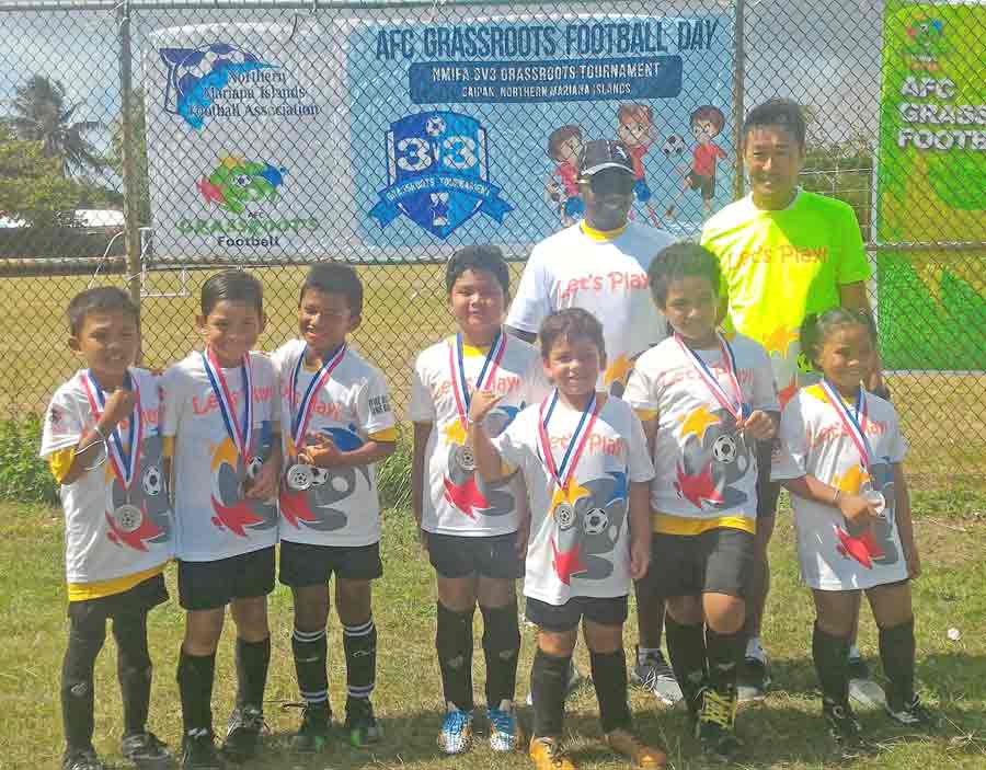 Participants in the AFC 3x3 Grassroots Football Tournament pose for a group photo after receiving their trophies, medals, and event T-shirts last at the Koblerville Elementary School Field.