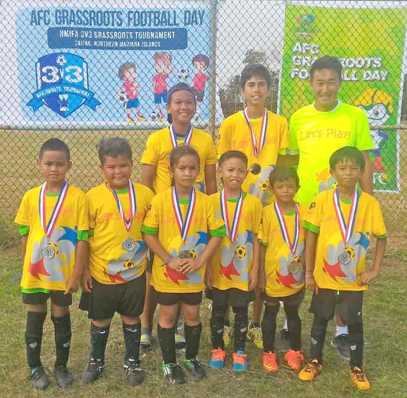 Kanoa FC players and coaches finished third in the U8 division and are joined in the photo by NMIFA general secretary Ross Zapanta, second row left, and technical director Michiteru Mita.