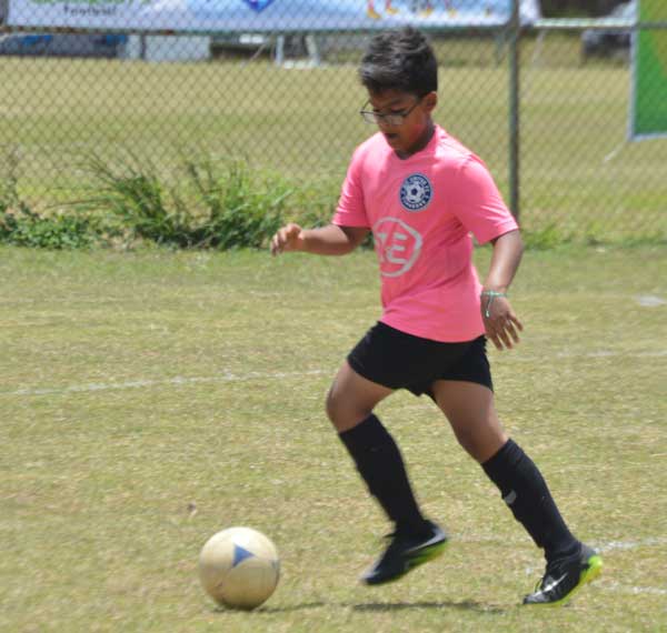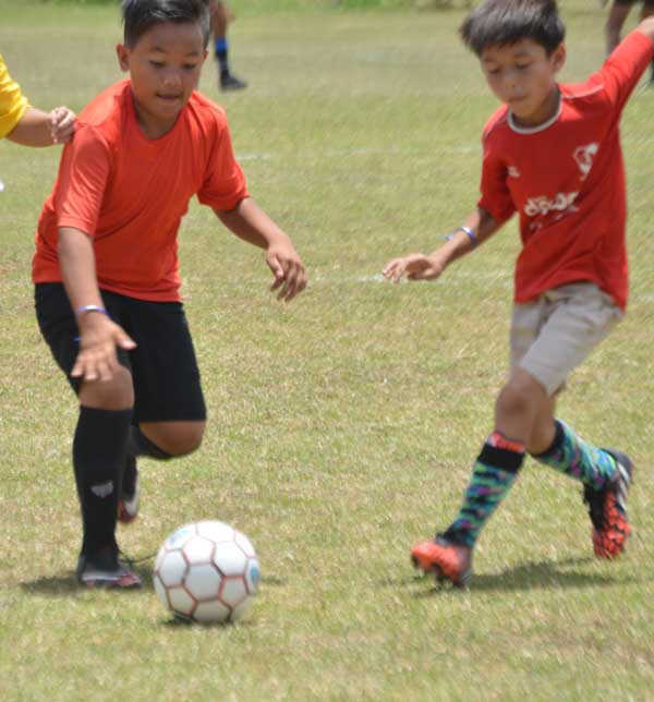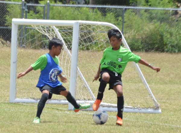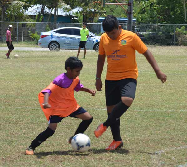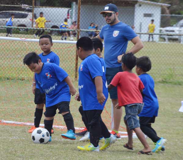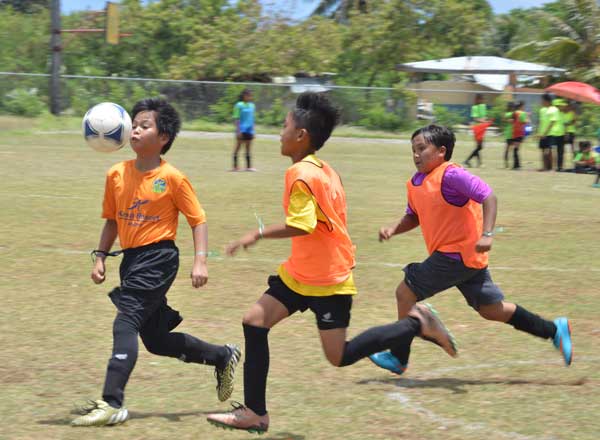Matansa and Kanoa players chase the ball during their co-ed U12 game in the Asian Football Confederation Grassroots Football Day 2017 3 vs 3 Tournament held early this month at the Koblerville Elementary School Field. (Roselyn B. Monroyo)