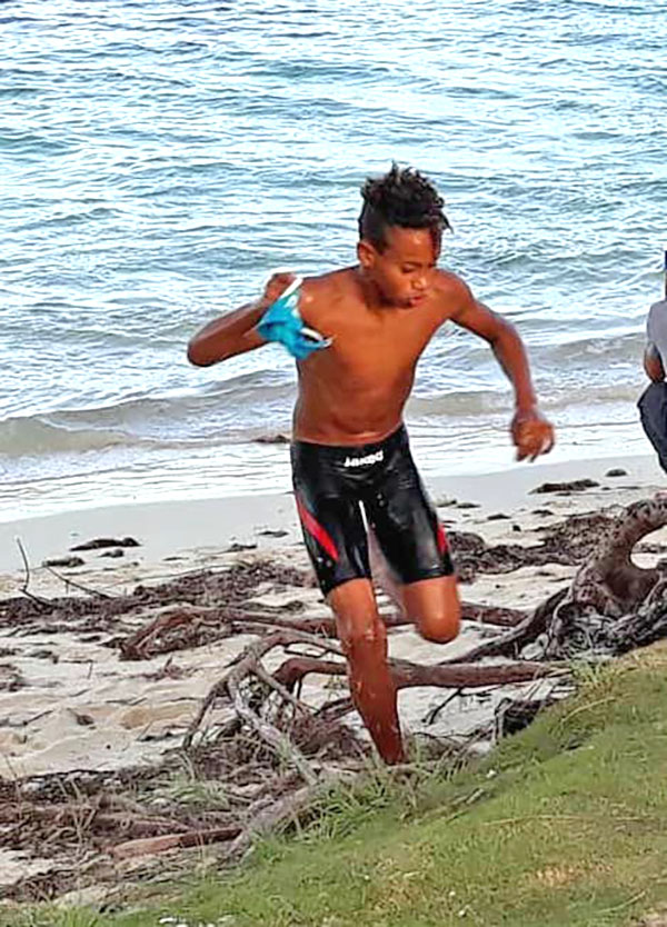 Isaiah Aleksenko heads to the swim-run transition area at Kilili Beach during last Saturday’s 4th IT&E Saipan Aquathlon and 10K Pathway Run. (Roby N. Pamintuan)