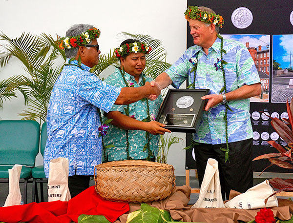 U.S. Mint director David Ryder hands out a plaque to Gov. Ralph DLG Torres and Lt. Gov. Arnold Palacios that contains a replica of the American Memorial Park quarter that was launched Tuesday at the AMP amphitheater on Beach Road in Garapan.