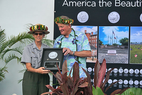 U.S. Mint director David Ryder hands a plaque of a bigger version of the U.S. quarter that bears the American Memorial Park design to AMP superintendent Barbata Alberti at the launch last Tuesday of the AMP quarter at the AMP amphitheater in Garapan