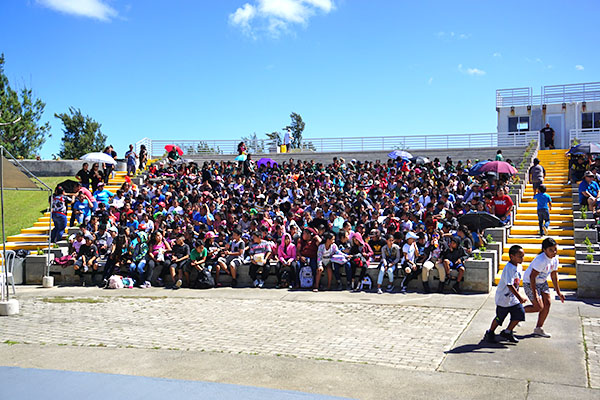 Hundreds of students from private and public schools attend the launch last Tuesday of the American Memorial Park quarter at the AMP amphitheater in Garapan.