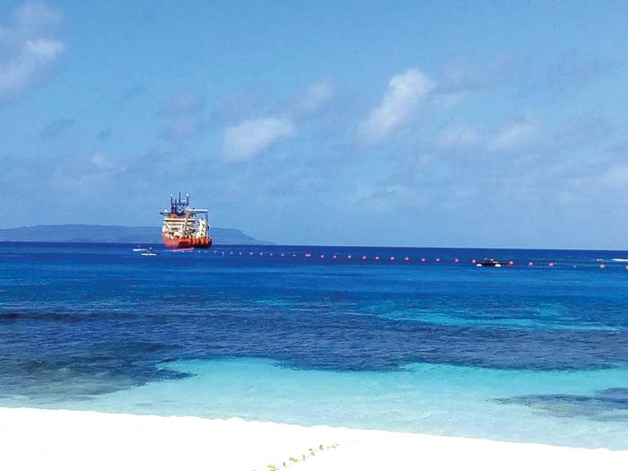 The CS Responder prepares the marine lay of Docomo Pacific's ATISA cable system at Tachonga Beach, Tinian on May 18, 2017. (DOCOMO PACIFIC)