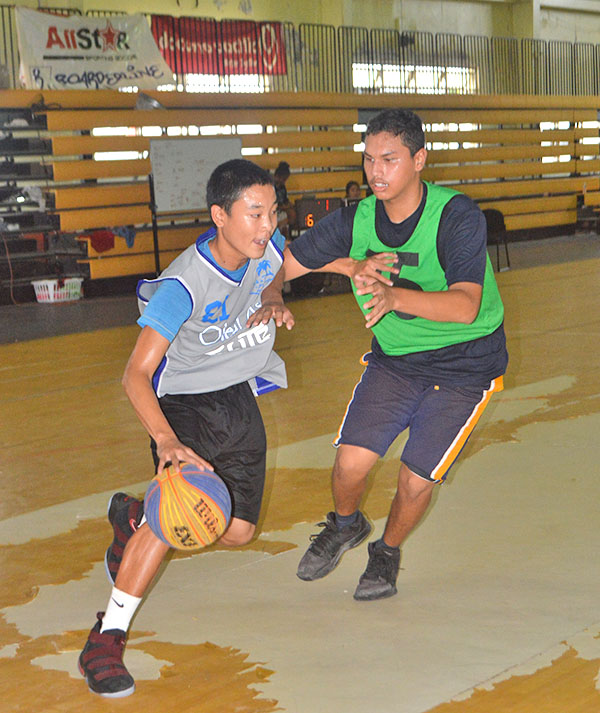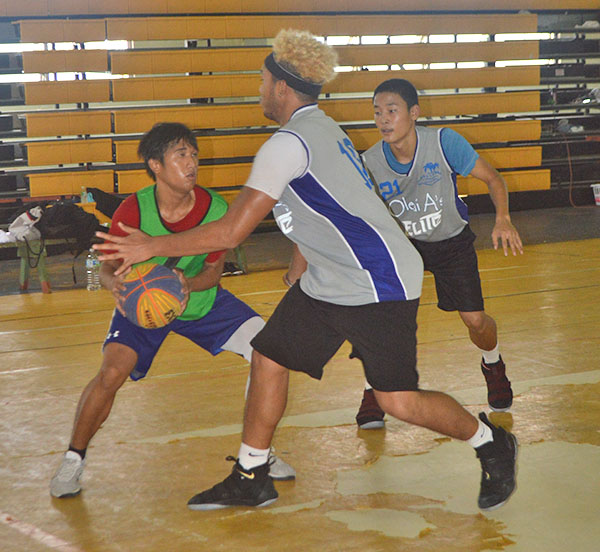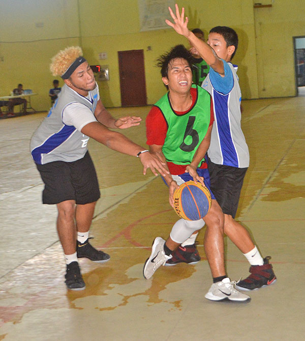 Hafa Adai’s Duncan Laxa, center, is fouled by the Ballerz’s Dean Blake, left, while the latter’s teammate, Coby Santos provides help defense during their title match in the qualifying tournament for the 2018 Mixed U-18 IBF Youth Leaders Basketball Cup last Saturday at the Gilbert C. Ada Gymnasium. The Ballerz won, 22-10.