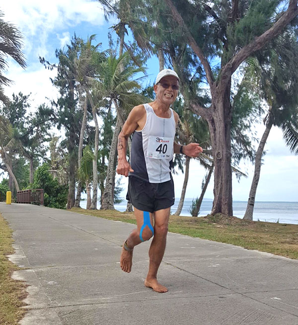 Saipan’s Chang Whan Jang runs barefoot along Beach Road during last Saturday’s 30th Tagaman Triathlon. (Contributed Photo)