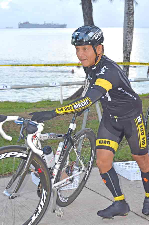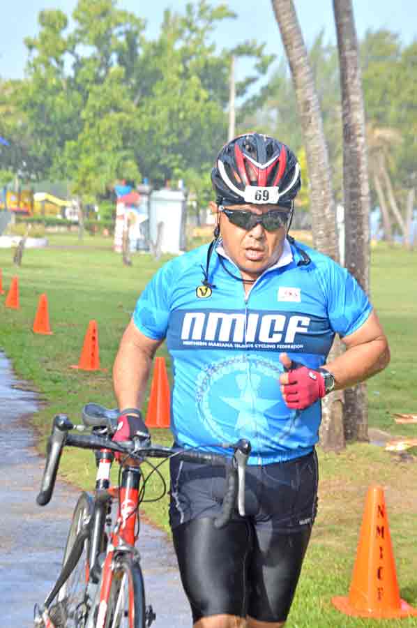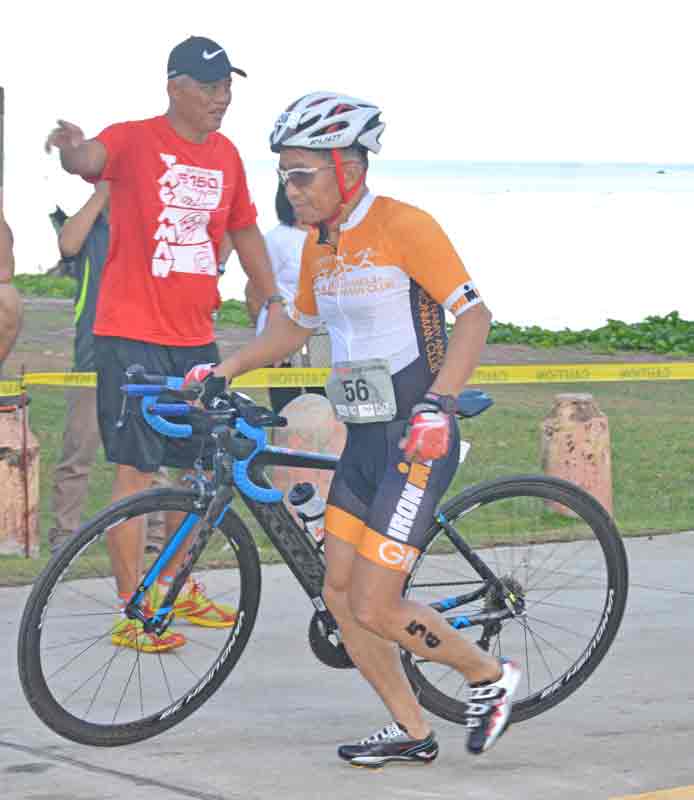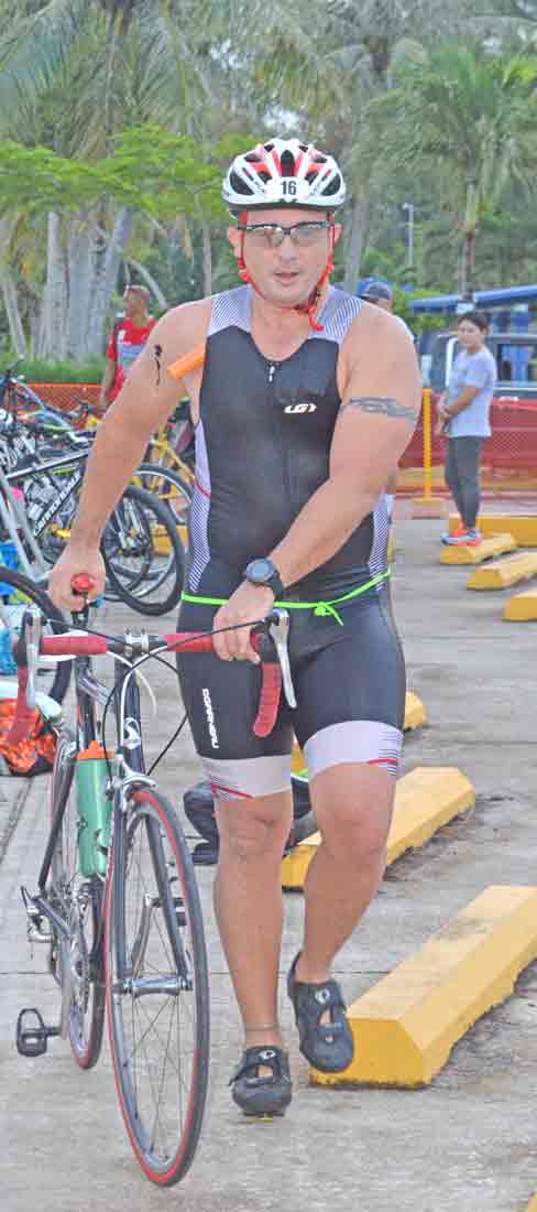 Ben Babauta walks his bike through the loop en route to transition area at Minatchom Atdao Pavilion during last Saturday’s Tagaman Triathlon.