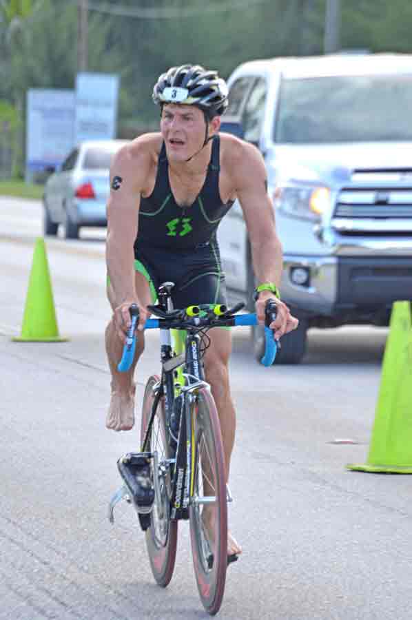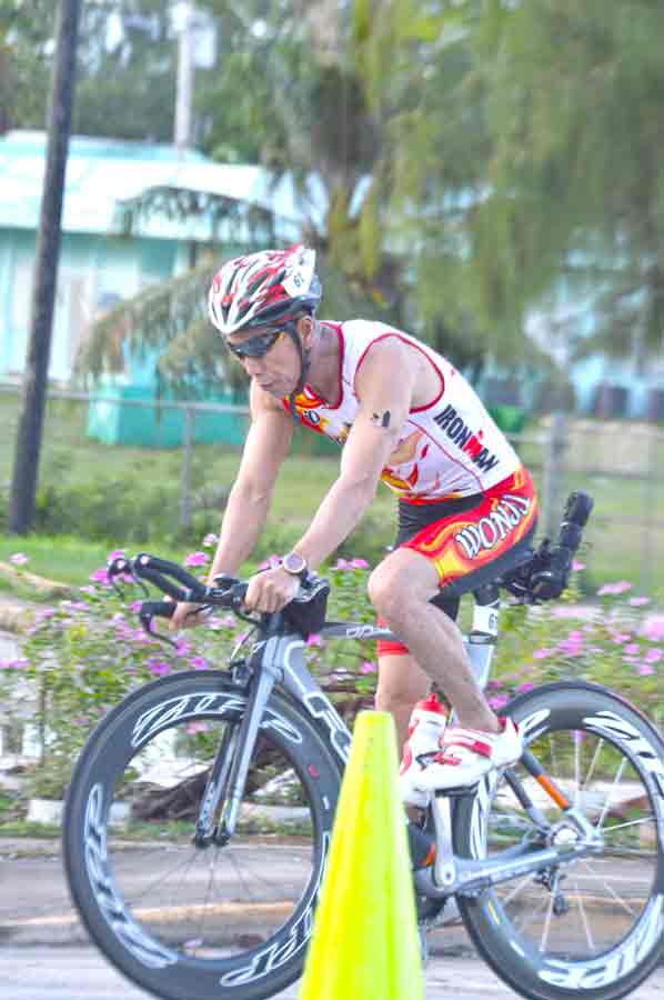 An off-island triathlete heads north for the 40K bike leg of the Tagaman Triathlon.