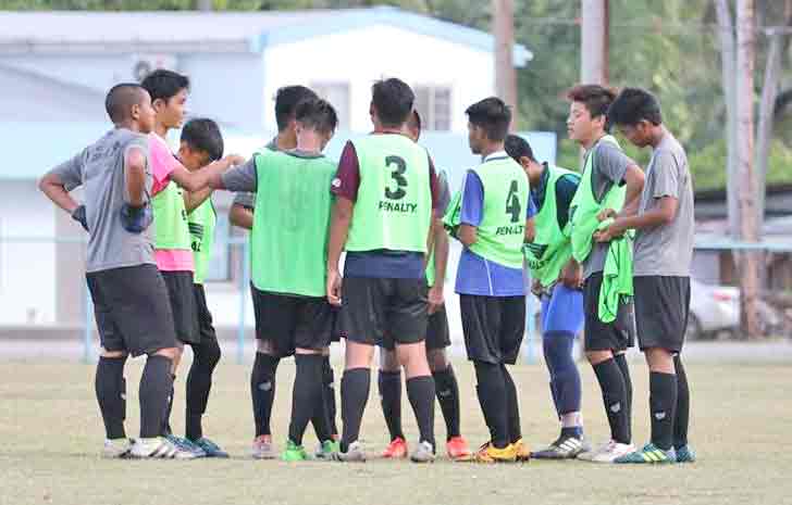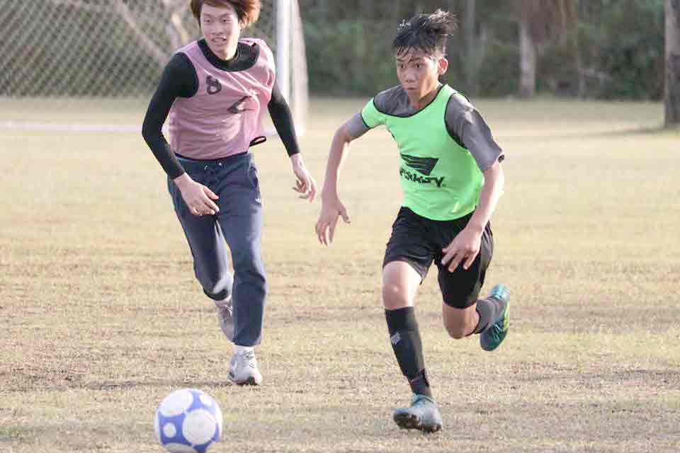 The CNMI Boys U15 National Team training pool’s Floyd Muna rights, runs ahead of a University Network for Global Leadership player as they chase the ball.