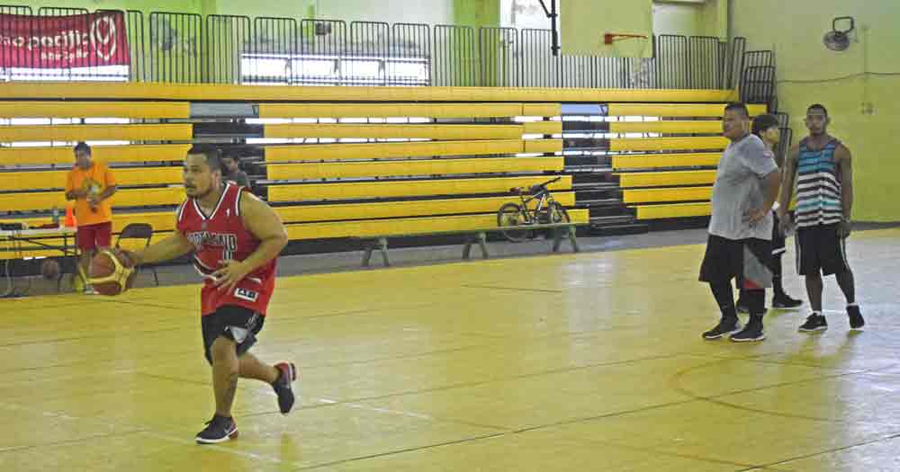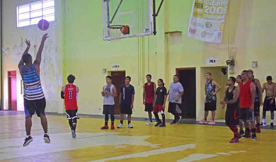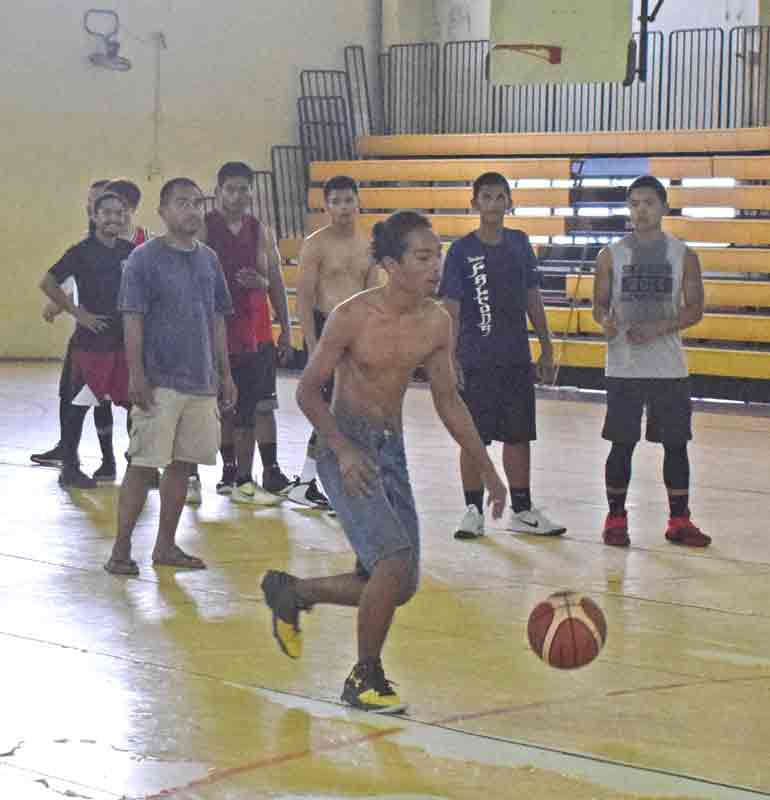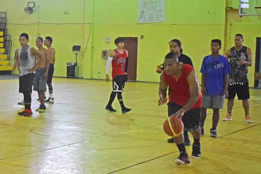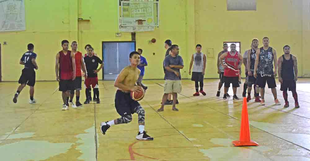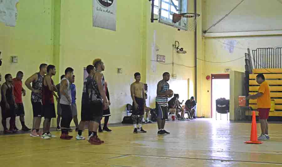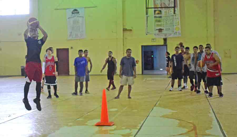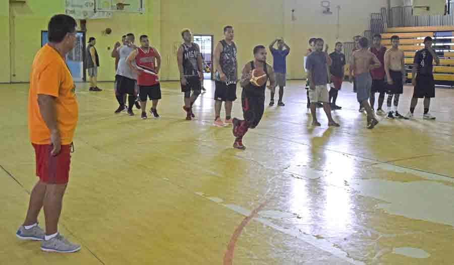 Mariana Islands Basketball Federation development officer Elias Rangamar, right, gives instructions to players before starting the drills during the first tryout for the CNMI men’s national basketball team last Saturday at the Gilbert C. Ada Gymnasium.