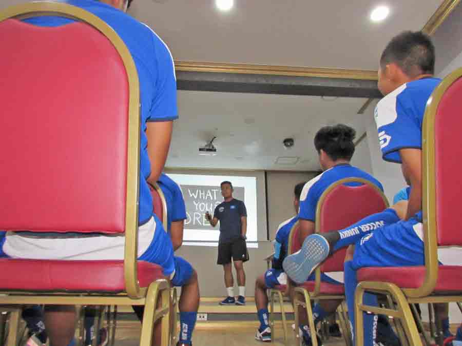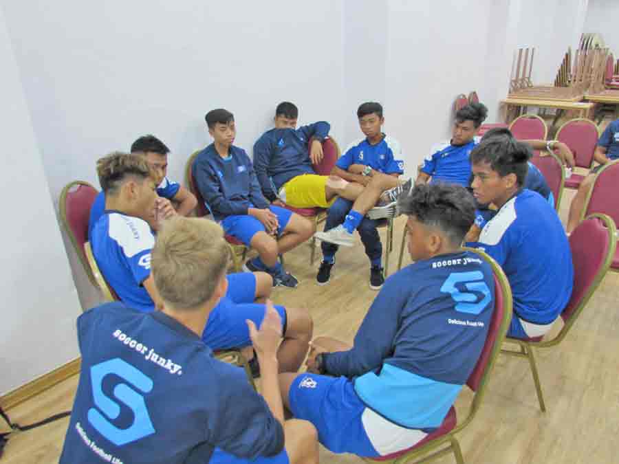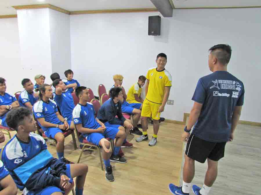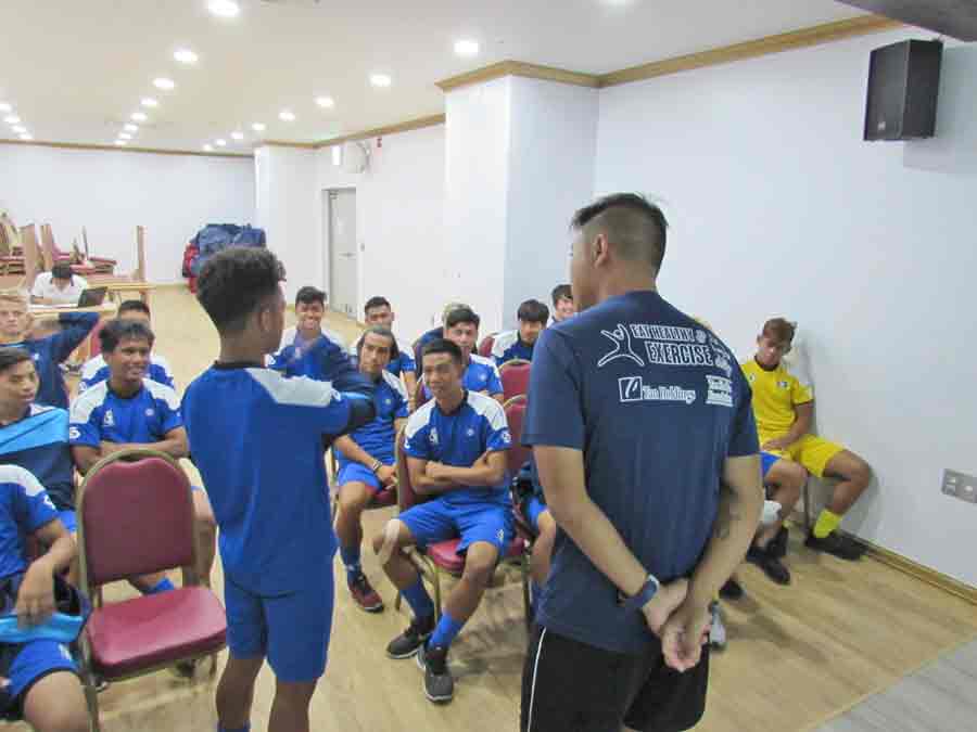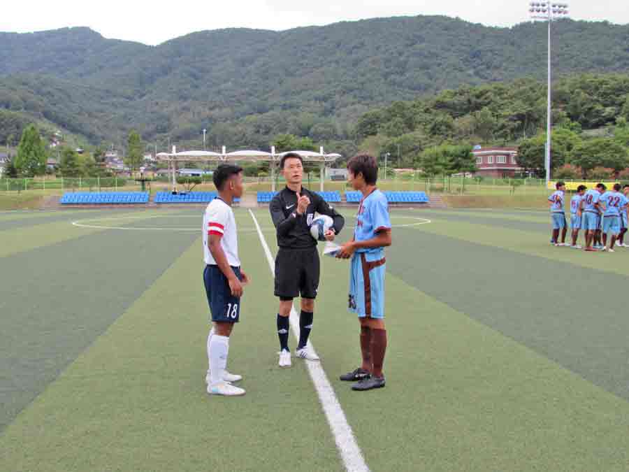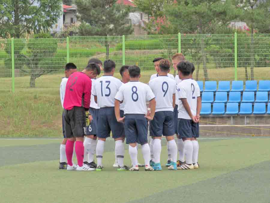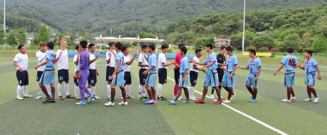The CNMI Boys U18 National Team players exchange high-gives with Japan’s Kyoto Kyoei Gakuen before the start of their match last week at the Changnyeong Sports Park in South Korea.
