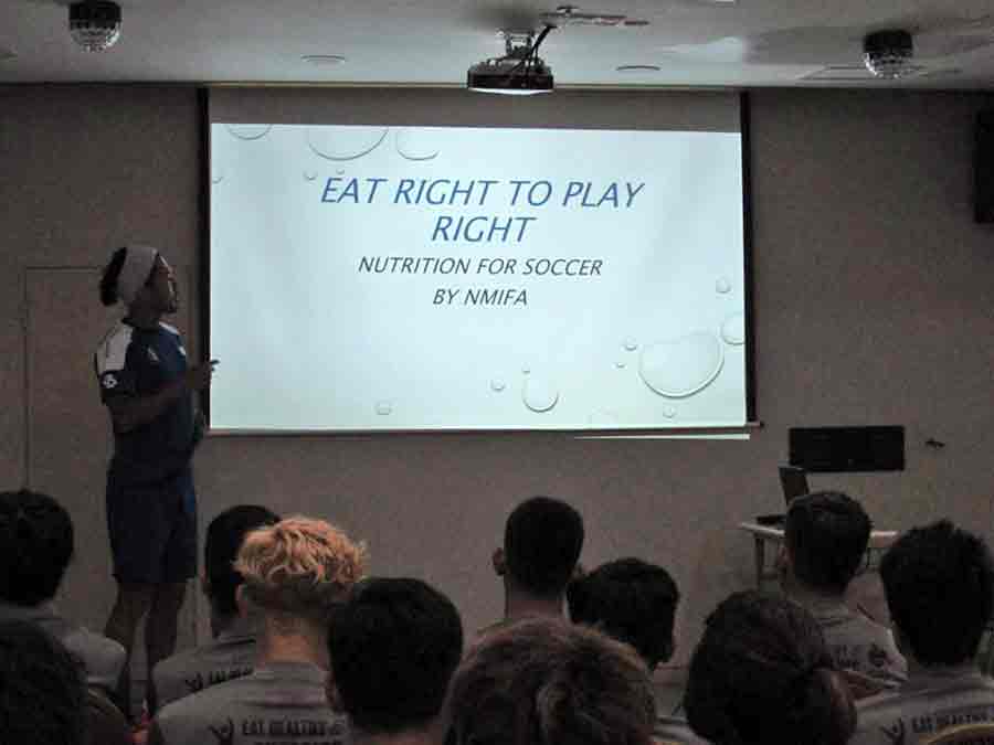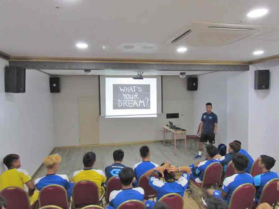 The CNMI Boys U18 National Team’s Anthony Fruit answers the question of assistant coach Jershwin Angeles during a classroom discussion in the Teen Ayuyus’ training camp at the Changnyeong Sports Park in South Korea last week.