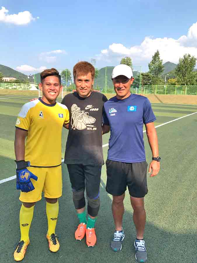 From left, goalie Chris Aninzo, former South Korean national team member Kim Byung Ji, and CNMI head coach Michiteru Mita, pose for a photo at the conclusion of Ji’s goalkeeper clinic.