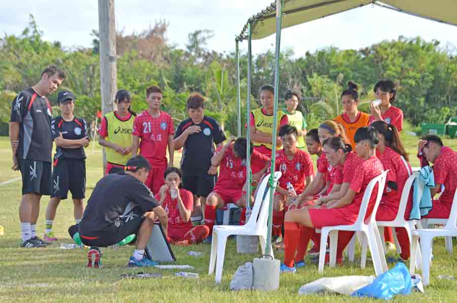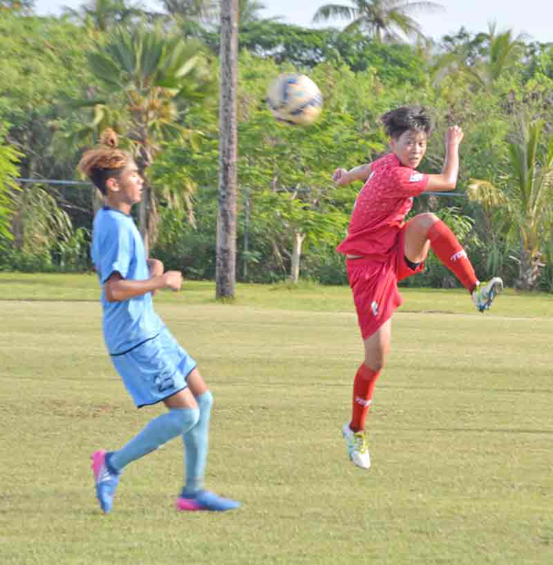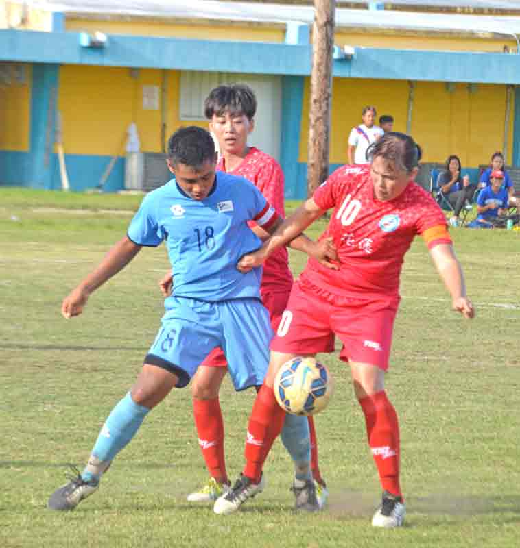 The CNMI Boys U18 National Team’s Thaiphi Austria, second left, tries to beat Hualien Football Club women’s team’s Wen-Lin Tan to the ball during the first half of their friendly game last Friday at the Hopwood Middle School Field. The Teen Ayuyus won, 5-0.
