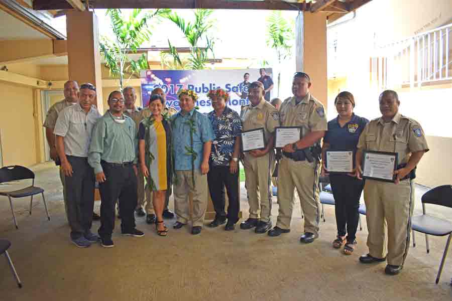 Gov. Ralph DLG Torres, fourth from left, first lady Diann Torres, third from left, Lt. Gov. Victor B. Hocog, fifth from left, and Saipan and Northern Islands Municipal Council chair Luis John Castro, second from left, join the awardees in the Department of Public Safety on Thursday. (Jon Perez)