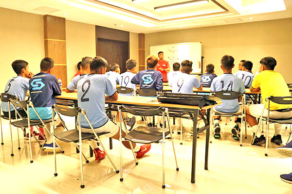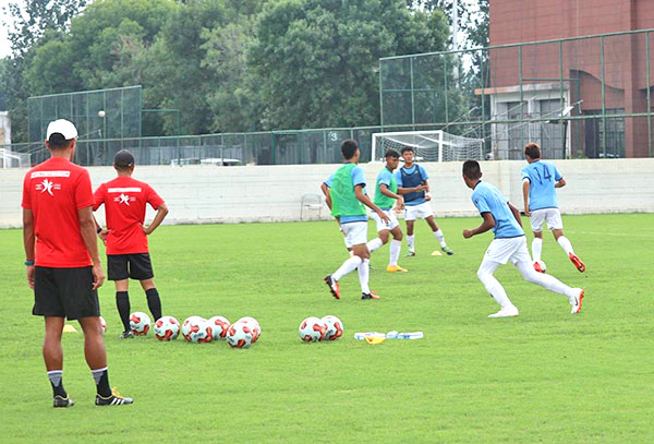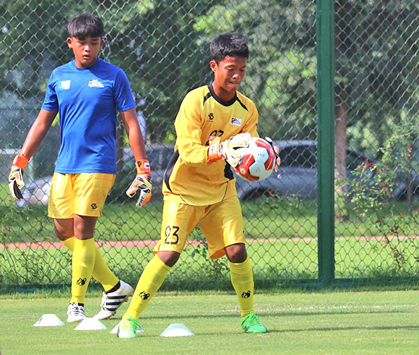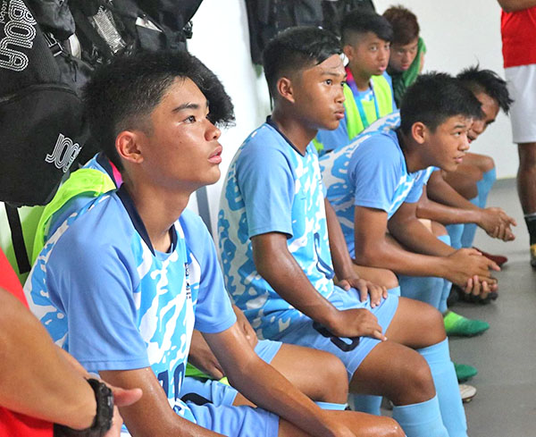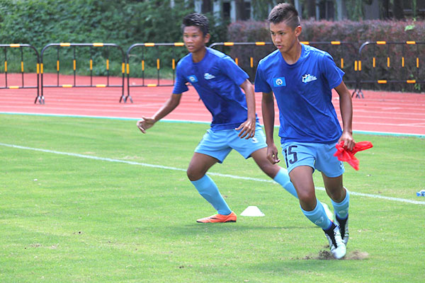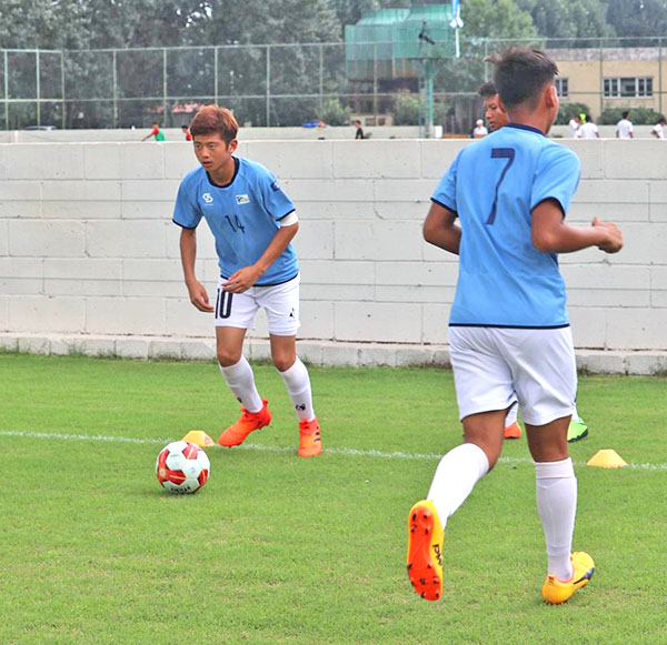 John Ezekiel Canape, left, and Merrick Toves perform warm-up drills before the CNMI Boys U15 National Team’s game in the East Asian Football Federation U15 Boys Tournament 2018 held last month in Xianghe, China.