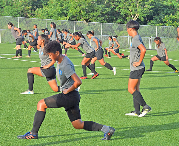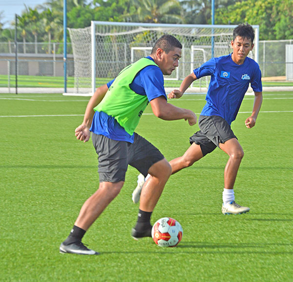 The CNMI men’s training pool’s Raymond Mercado, left, dribbles in front of the defense of the CNMI boys U16’s Ichiro Borja during a practice session at the NMI Soccer Training Center in Koblerville late last month.