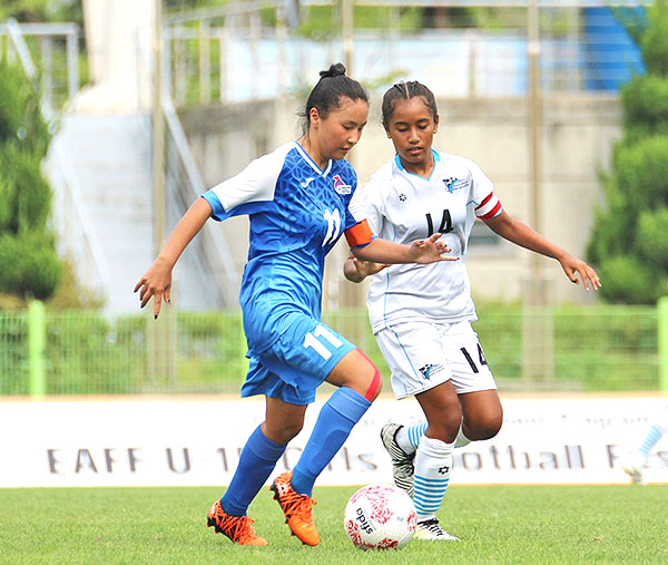 The CNMI’s Janna Casarino, left, dribbles past Mongolian defender Nomin Munkhbaatar during the first half of their game in the 2019 East Asian Football Federation U15 Girls Festival last Tuesday at the Mokpo International Football Training Center in South Korea. (East Asian Football Federation)