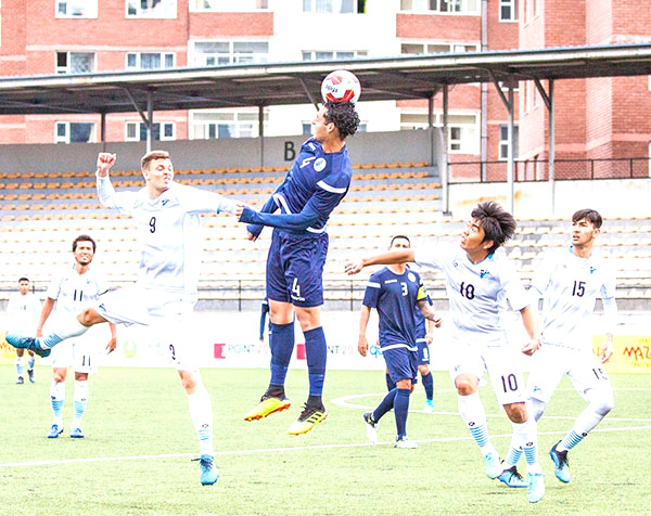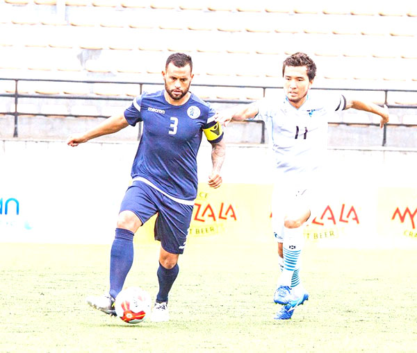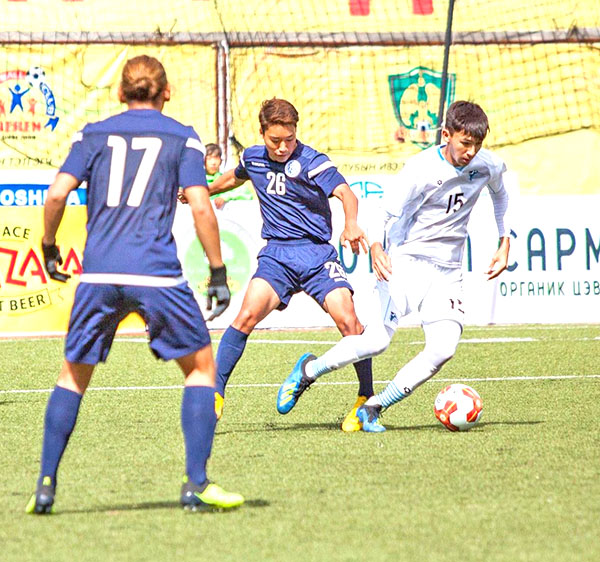 The CNMI Men’s National Team’s Jonathan Capayas, center, attempts to steal the ball from Guam’s Isaiah Lagutang during their game in the EAFF E-1 Football Championships 2019 Round 1 last Sunday at the Mongolian Football Federation Stadium in Ulan Bator, Mongolia.