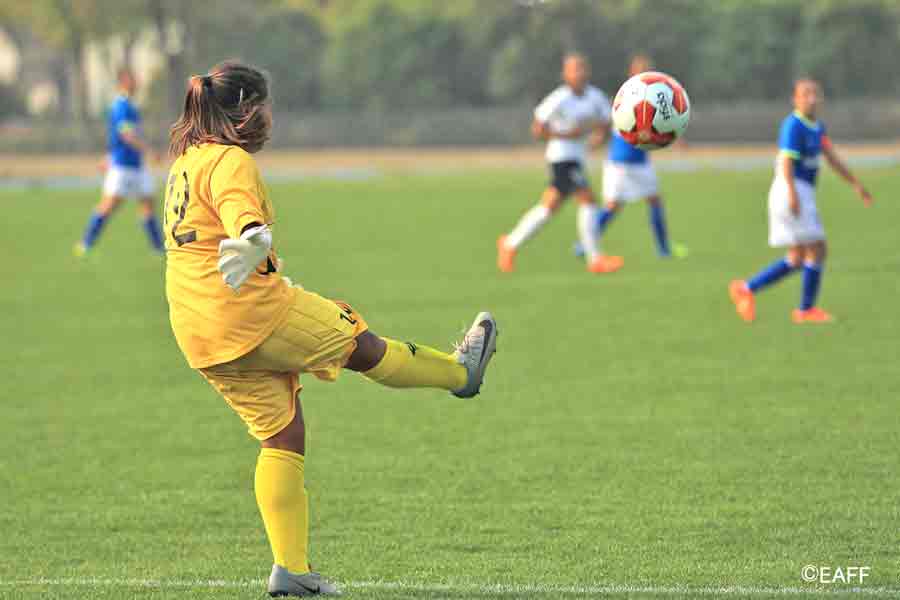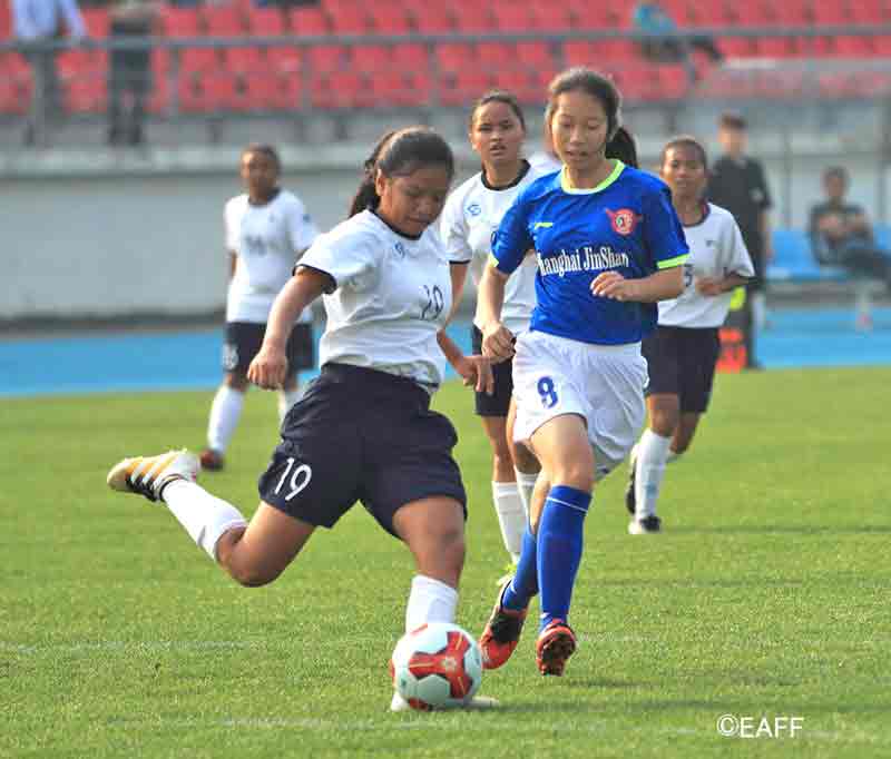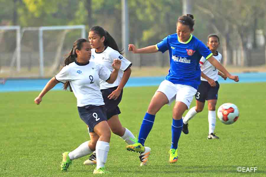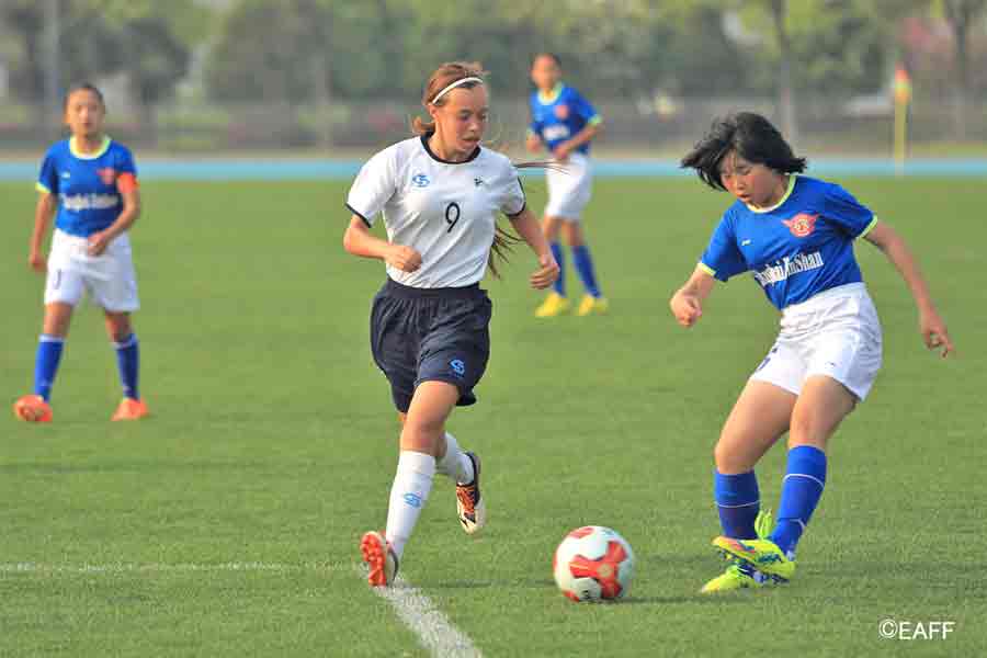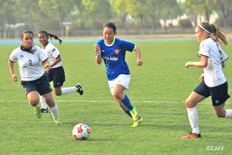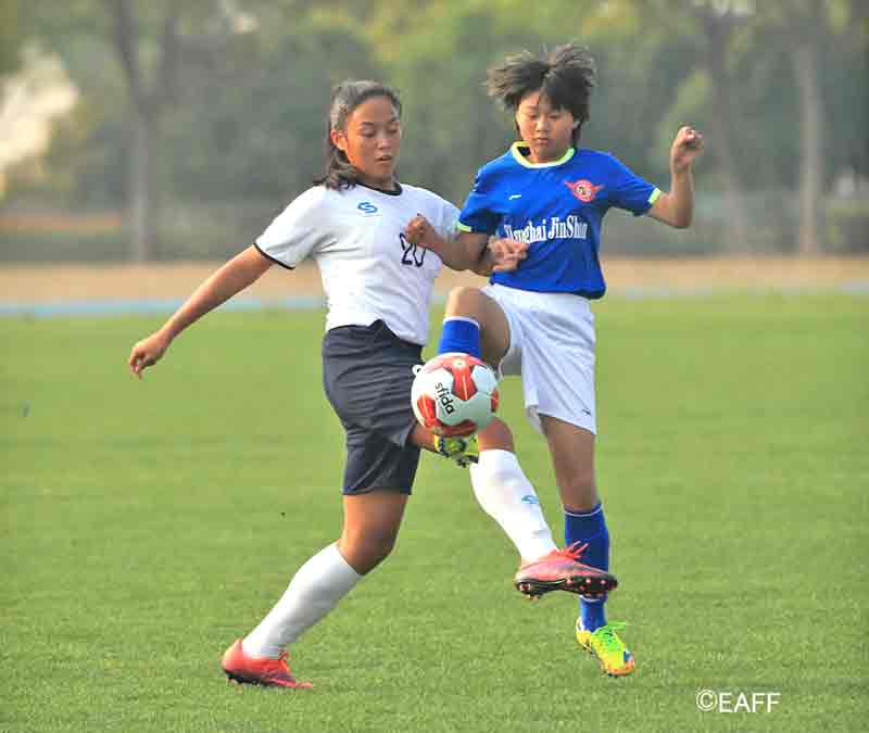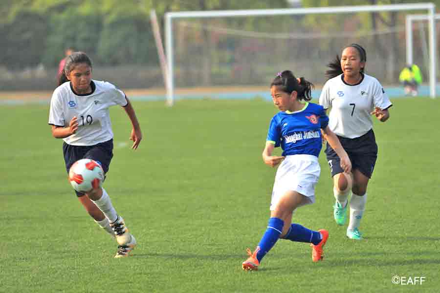 The CNMI Girls U15 National Team’s Princess Alcantara, left, and Esther Jones, right, sandwich a Jinshan District player during the first half of their game in the EAFF U15 Girls Tournament 2017 Jinshan Sports Center last Sunday in Shanghai, China. (East Asian Football Federation)