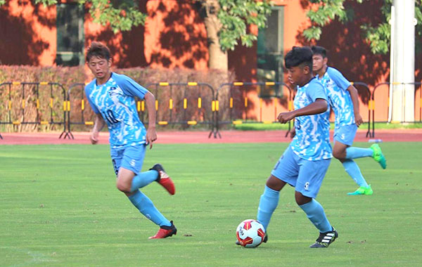 The CNMI’s starting 11 huddle before the start of their game against Macau in the East Asian Football Federation U15 Boys Tournament 2018 in Xianghe, China, last Monday. The CNMI won, 1-0.