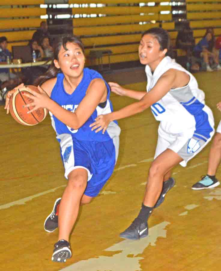 Mt. Carmel School 1 (blue uniforms) and 2 players pose for a photo after their title match in the girls high school division of the 2017-2018 Commonwealth Coalition of Private Schools Basketball League last Friday at the Gilbert C. Ada Gymnasium. MCS 1 won, 27-13. (Contributed Photo)