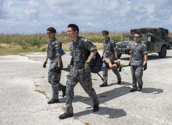 Medical service members from the Japan Air Self-Defense Force carry U.S. Air Force Airman 1st Class Kelly Destiny, 36th Mobility Response Squadron, during Cope North 2019 at Camp Baker on Tinian last Feb. 27, 2019.