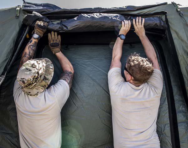 Two U.S. Air Force members with the 36th Mobility Response Squadron, prepare to collapse a tent during exercise Cope North 19 on Tinian last Feb. 28, 2019.