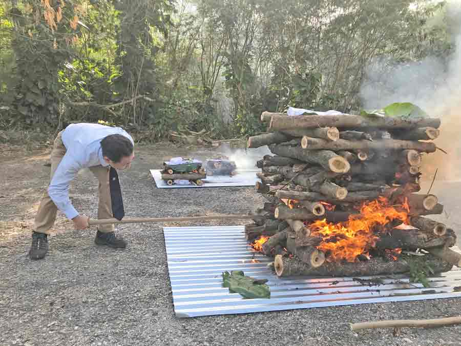 Members of the Japanese Association for Recovery and Repatriation of War Casualties light the wooden logs during their first cremation ceremony last Feb. 6 at the Banadera Trail in Marpi.