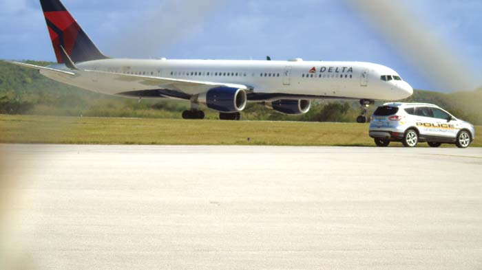 A Delta Air Lines aircraft carrying over 100 passengers from Japan lands at the Francisco C. Ada International Airport yesterday afternoon shortly after the pilot reportedly made an emergency call to the Commonwealth Ports Authority due to a mechanical issue. Other photo shows Department of Fire and Emergency Medical Services personnel and emergency vehicles on standby at the airport, shortly before the Delta plane landed and pulled up to its gate. (Ferdie de la Torre)