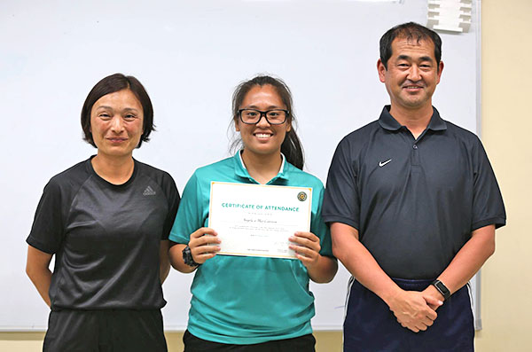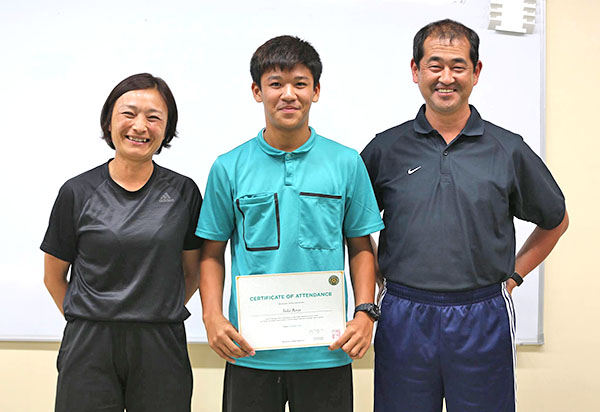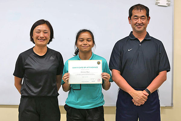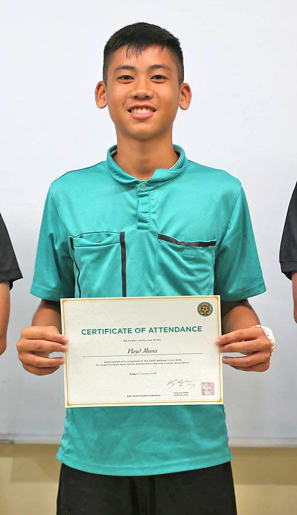 Jeralyn Castillo, center, poses with her East Asian Football Federation Referee Development Course certificate of attendance during the awards ceremony last week at the Guam Football Association National Training Center in Dededo. Five-time AFC Referee of the Year Sachiko Yamagishi and Tadashi Hase of Japan were the instructor and assistant instructor, respectively, of the four-day course.